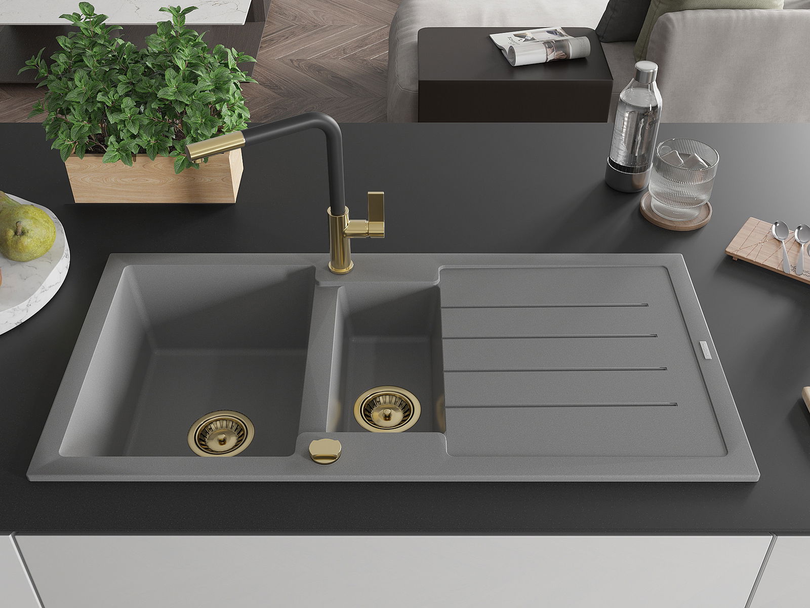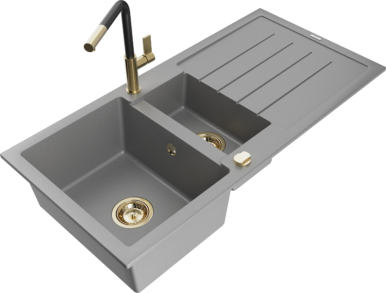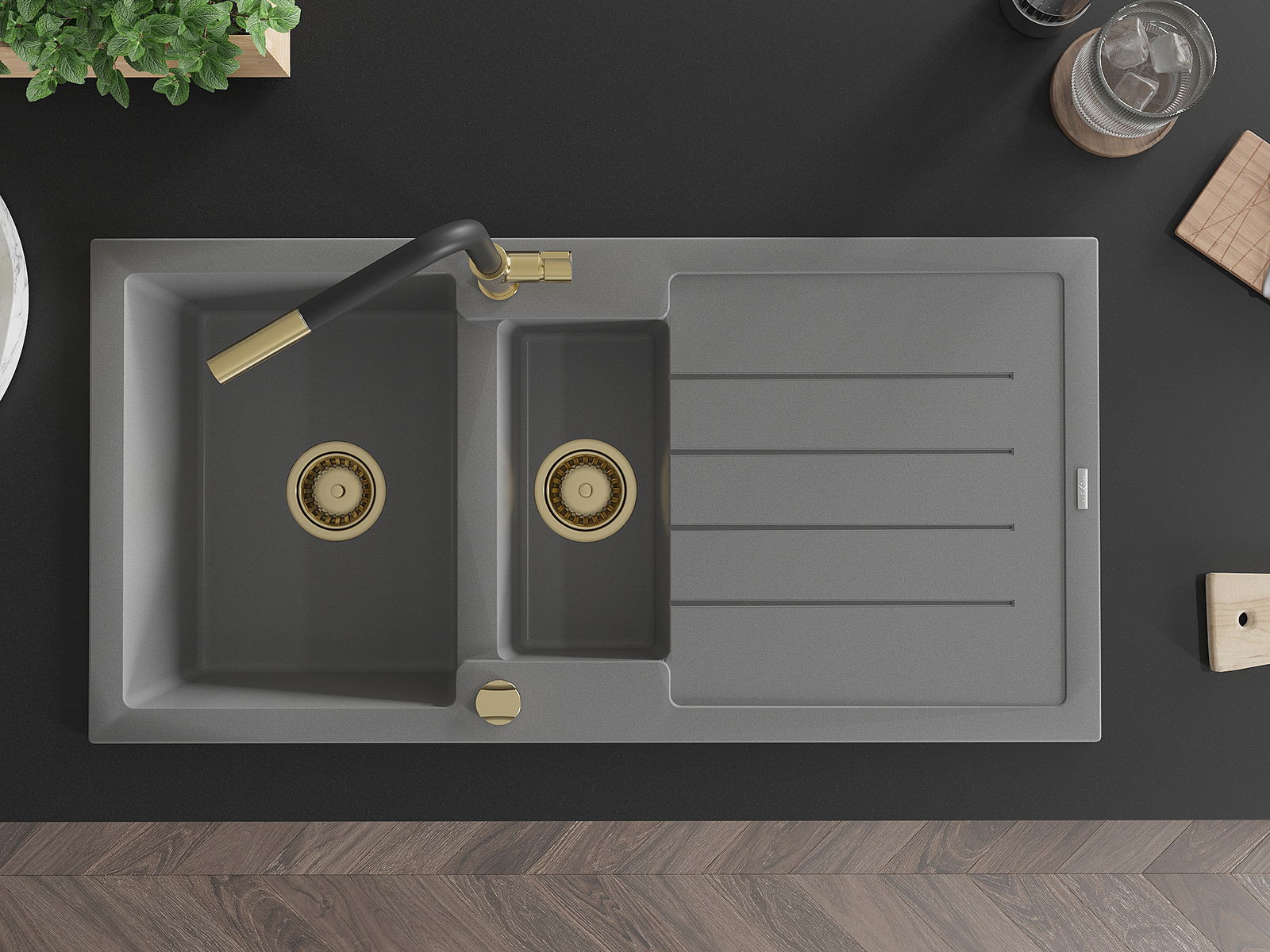Mexen Andres granit izlietne 1,5 nodalījumu ar noteku un virtuvju jaucējkrānu Flora, pelēks - 6515-71-670401-57-G