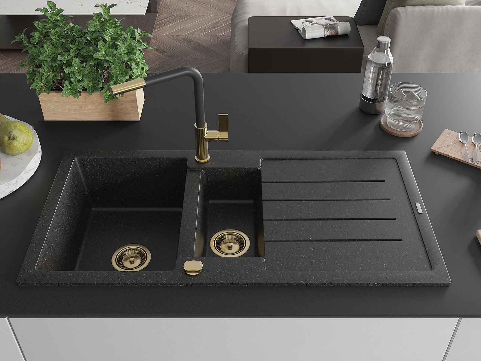 Mexen Andres granīta izlietne ar 1,5 nodalījumiem, notecējumu un Flora virtuves jaucējkrānu, melna/sudraba - 6515-73-670401-57-G