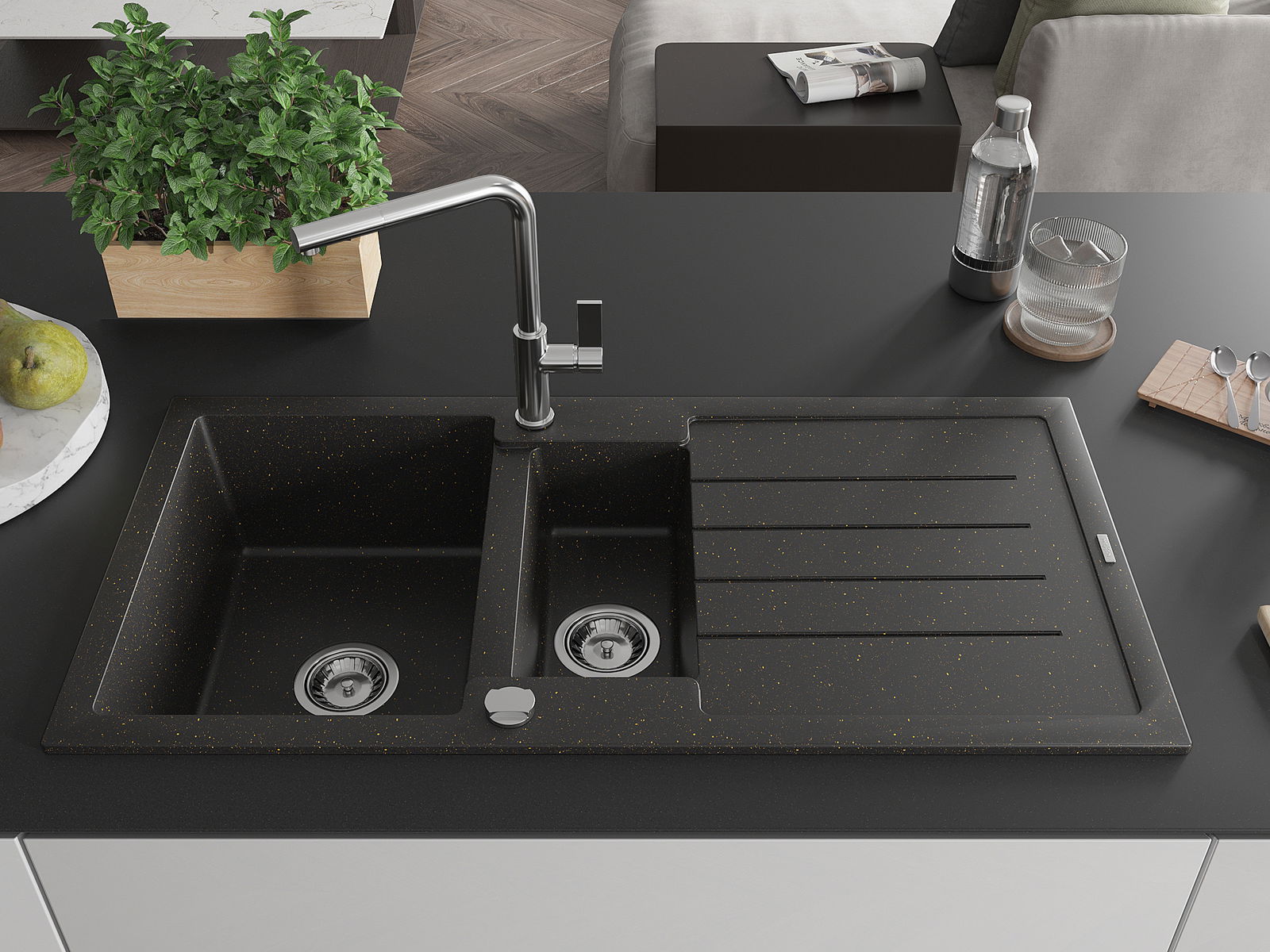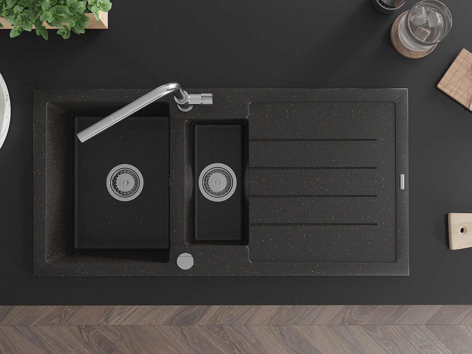 Izlietnei ir 2 daļēji izurbtas atveres ar diametru 35 mm, kuras var pašrocīgi izsist. Tās var izmantot, piemēram, šķidruma dozatora uzstādīšanai, kas novērsīs plastmasas pudeļu klātbūtni virtuvē un piešķirs tai elegantu apdari.