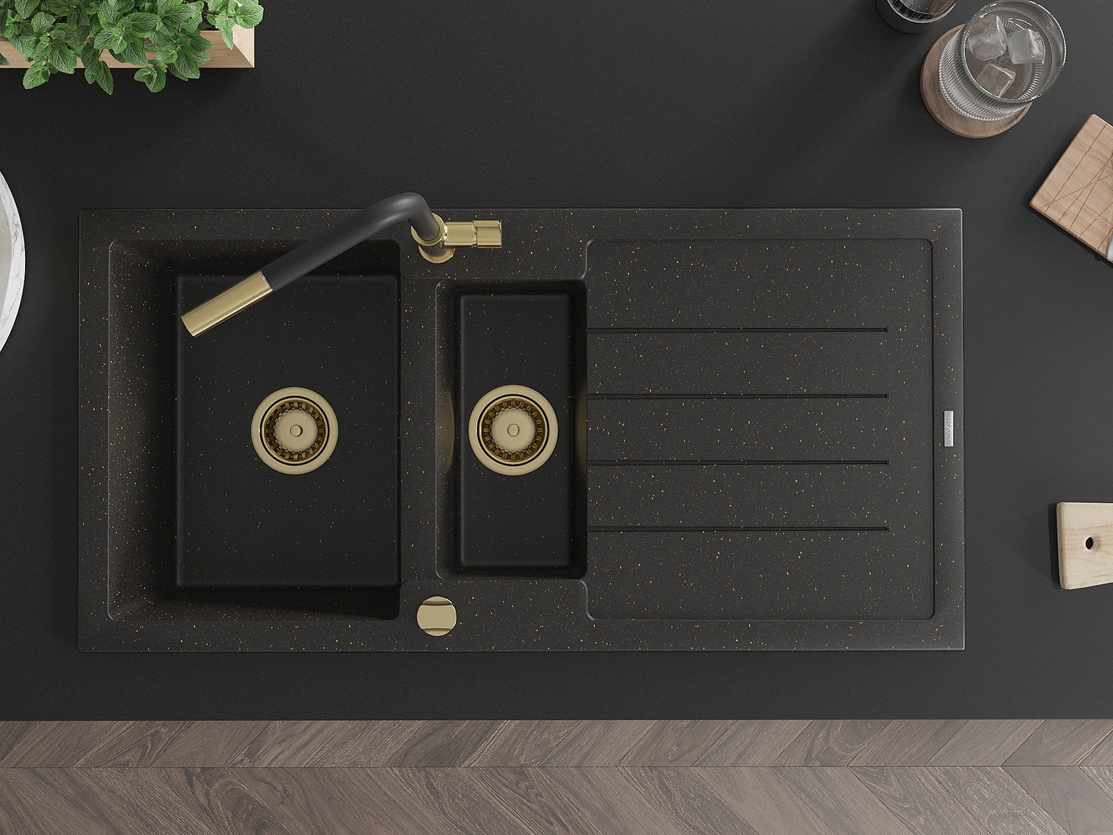 Mexen Andres 1,5 nodalījumu granīta izlietne ar noteku un Flora virtuves jaucējkrānu, melna/zeltīta - 6515-75-670401-57-G
