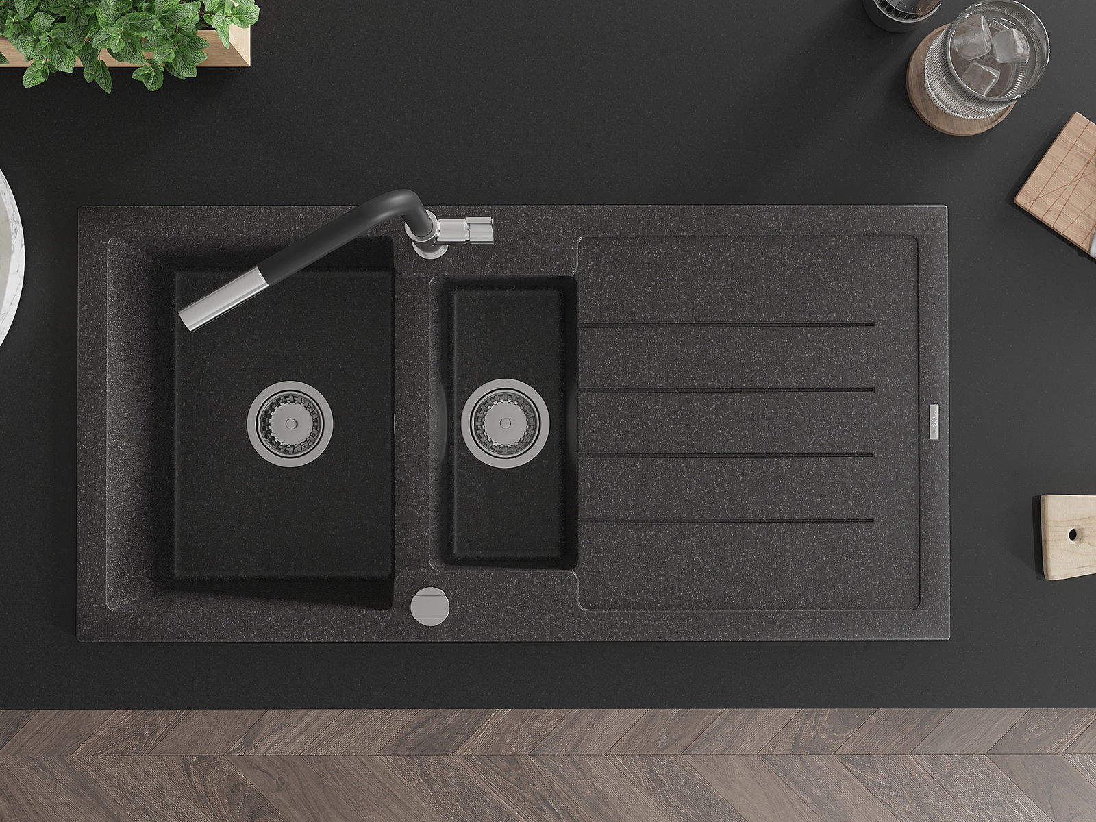Mexen Andres granitlējums 1,5 nodalījumā ar notecētāju un virtuves jaucējkrānu Flora, melns raibs - 6515-76-670401-07