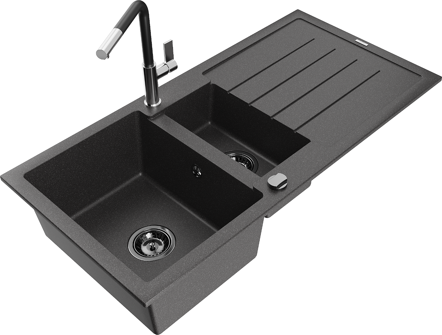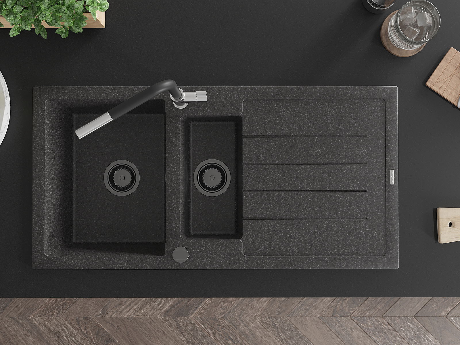 Mexen Andres granitā izlietne ar 1,5 nodalījumiem, notecētāju un virtuves jaucējkrānu Flora, melna ar plankumiem