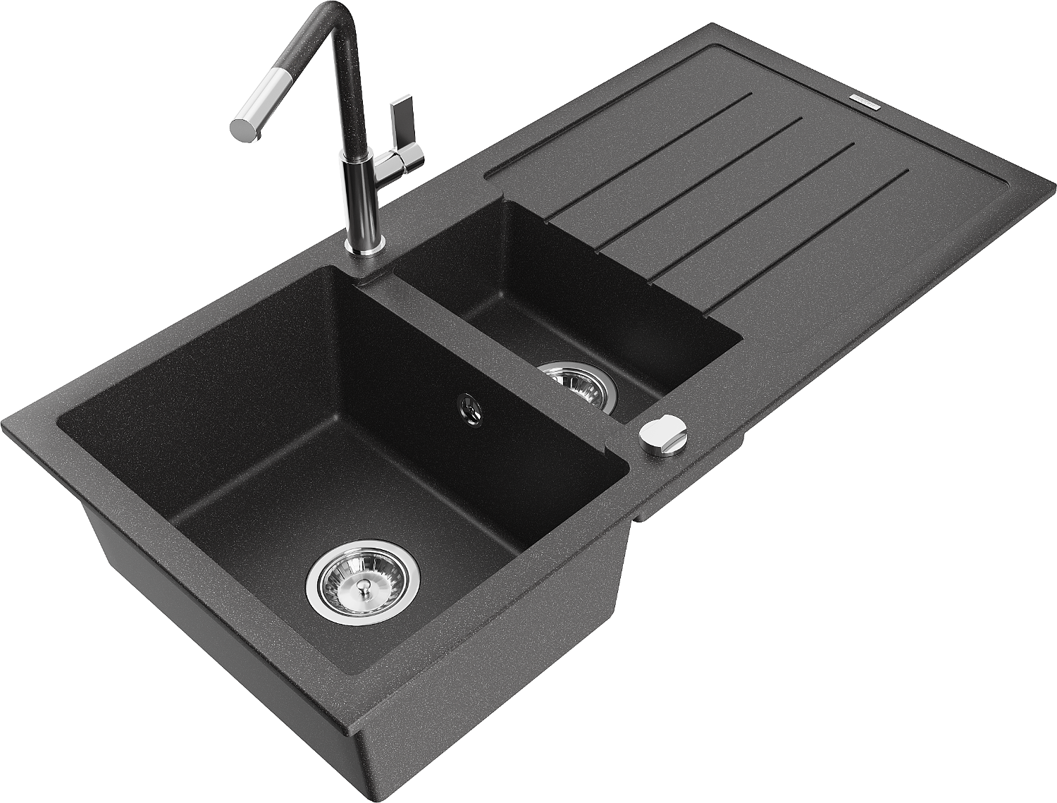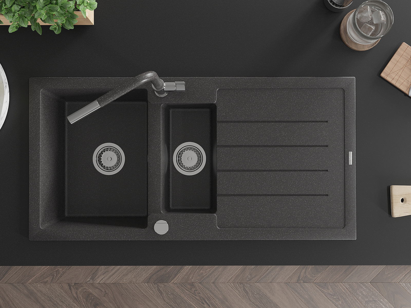 Mexen Andres granīta izlietne 1,5 nodalījumu ar notecētavu un virtuve krānu Flora, melnā krāsā ar plankumiem - 6515-76-670401-08