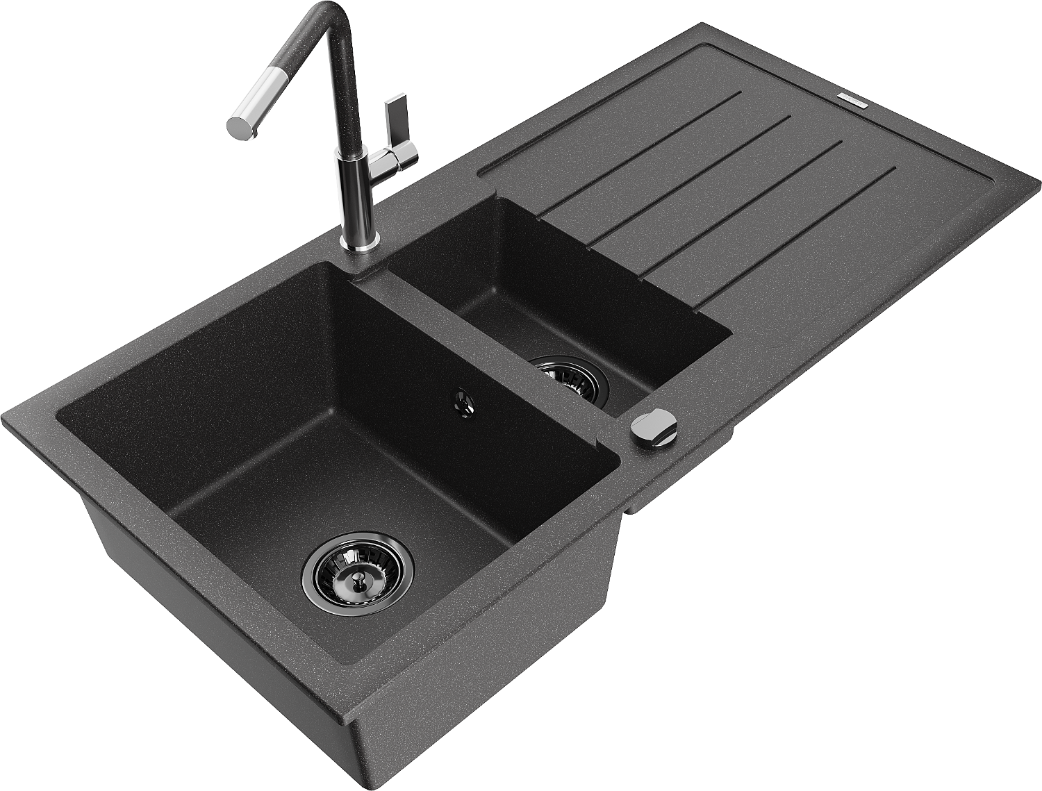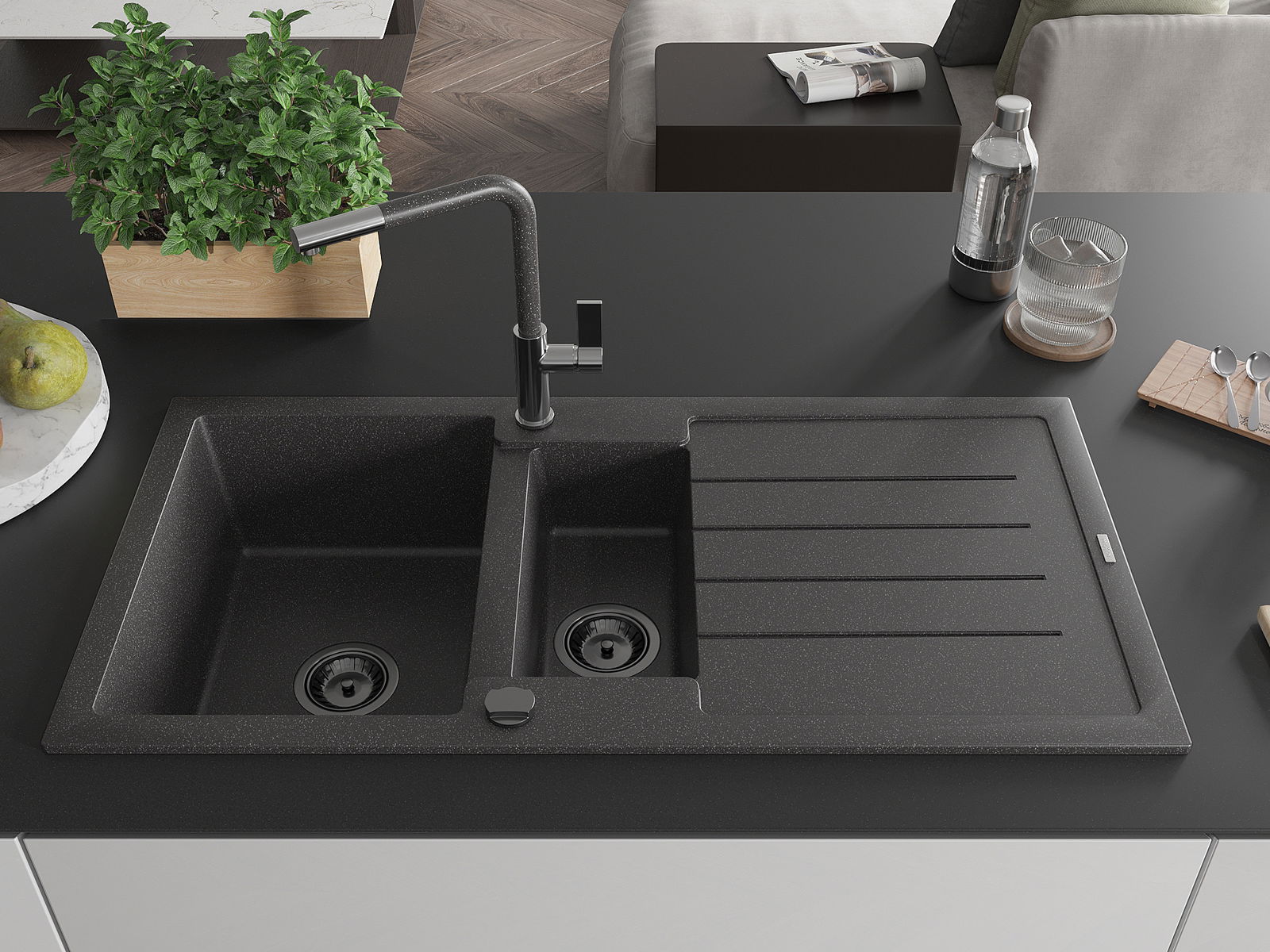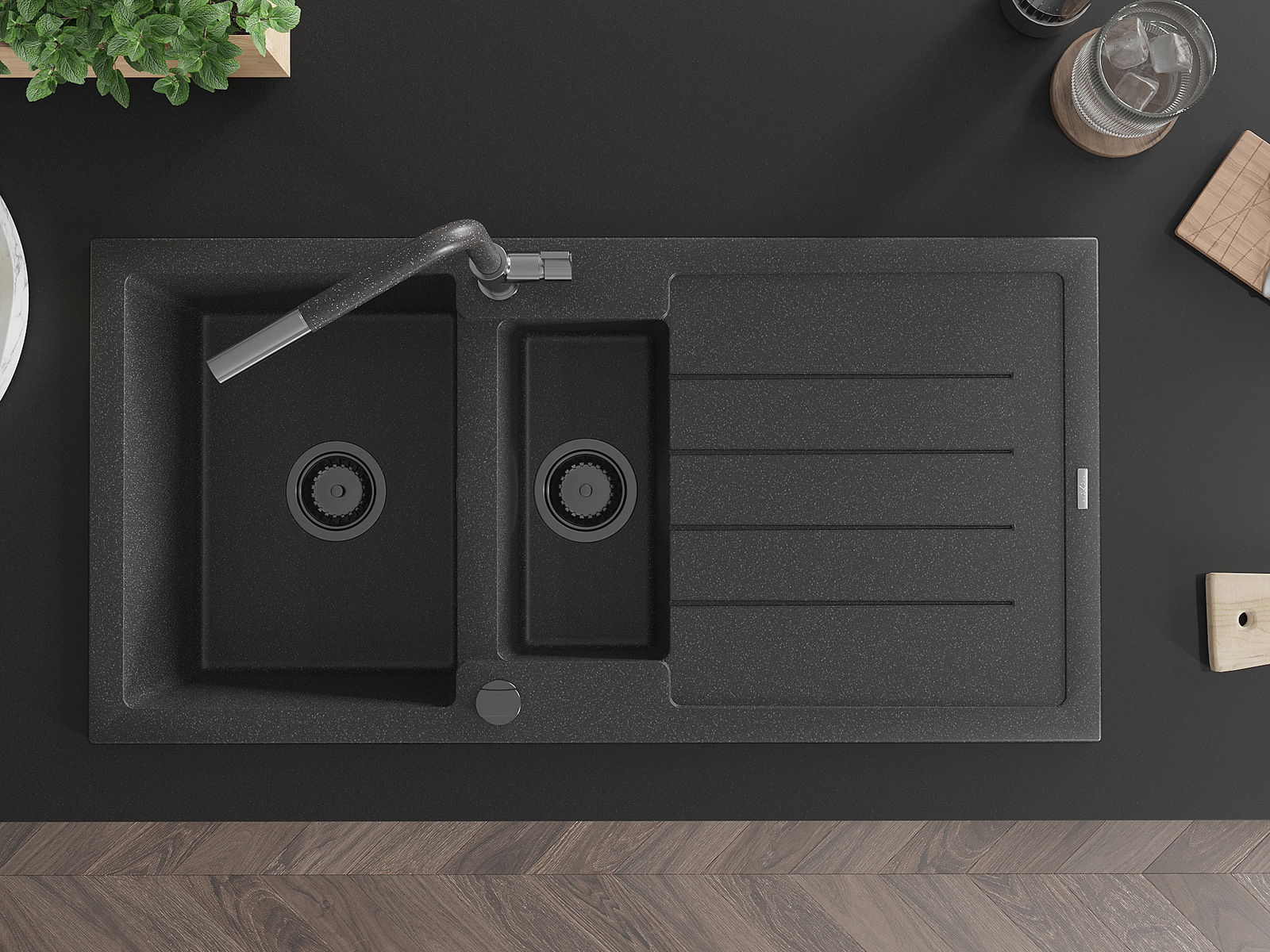 Mexen Andres granīta izlietne 1,5 nodalījuma ar nosusinātāju un Flora virtuves jaucējkrānu, melns ar plankumiem