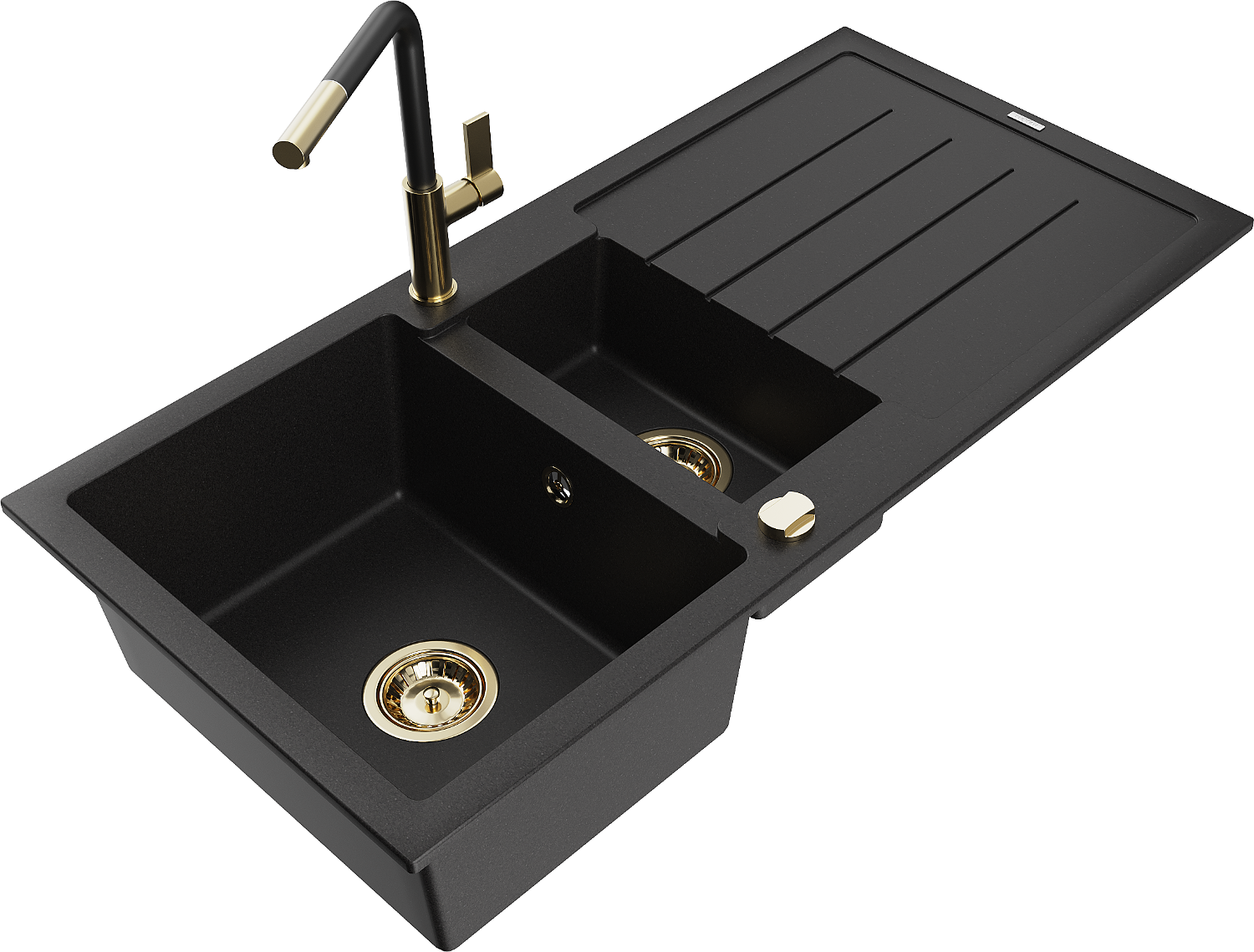 Mexen Andres granīta izlietne 1,5 nodalījums ar notecinātāju un virtuves jaucējkrānu Flora, melna - 6515-77-670401-57-G