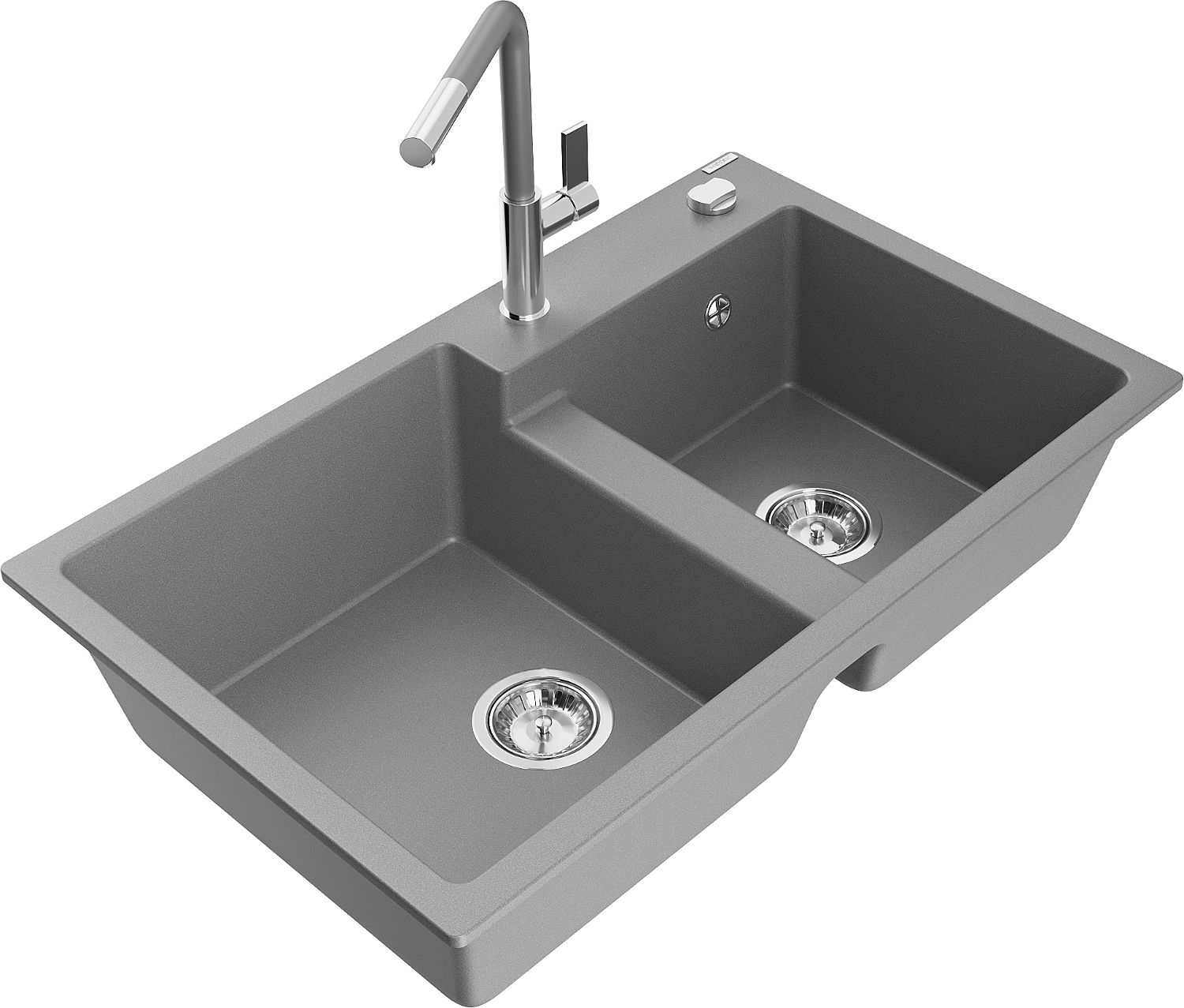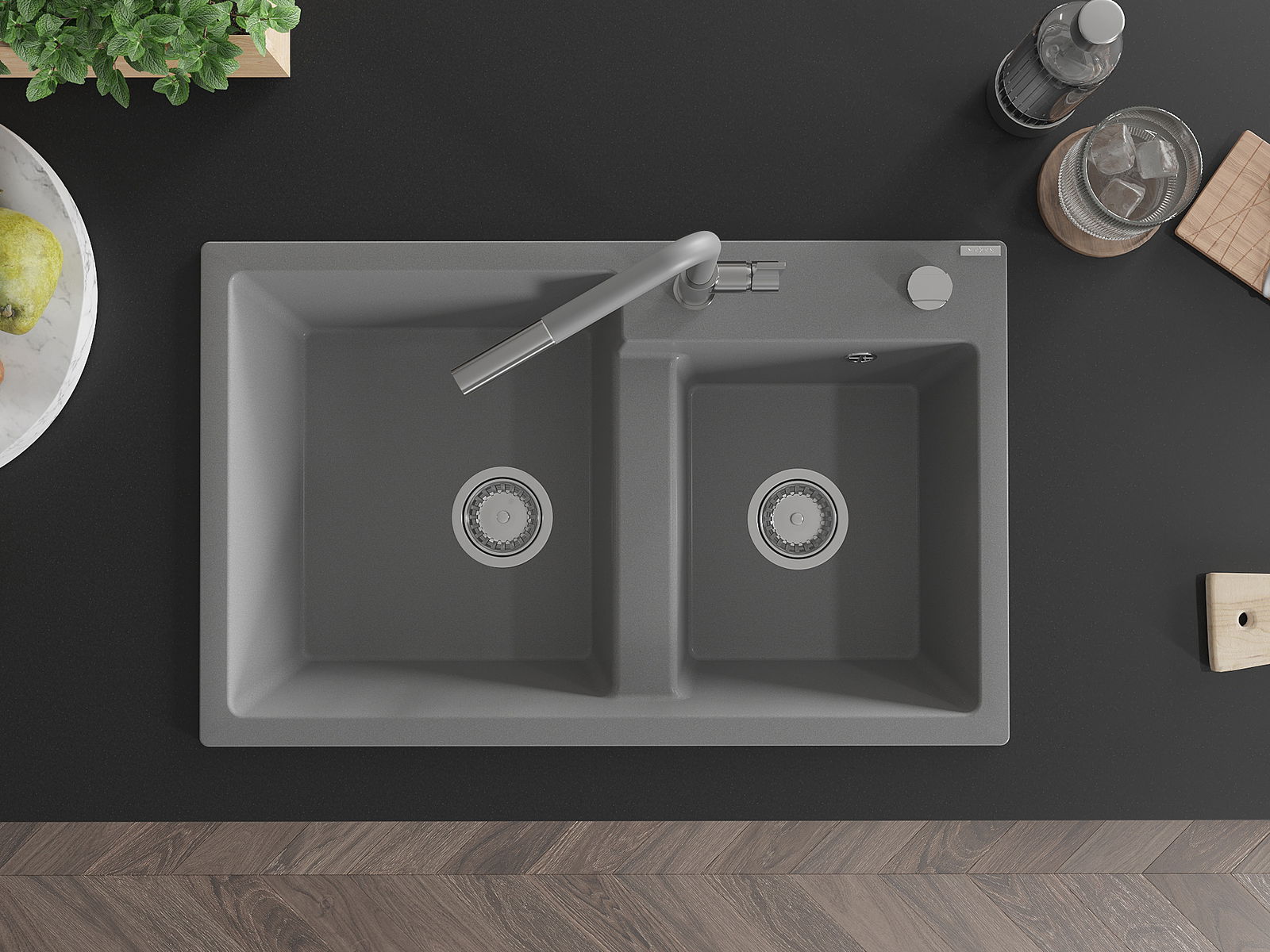 Mexen Tomas divu nodalījumu granīta izlietne ar Flora virtuves jaucējkrānu, pelēka - 6516-71-670401-06