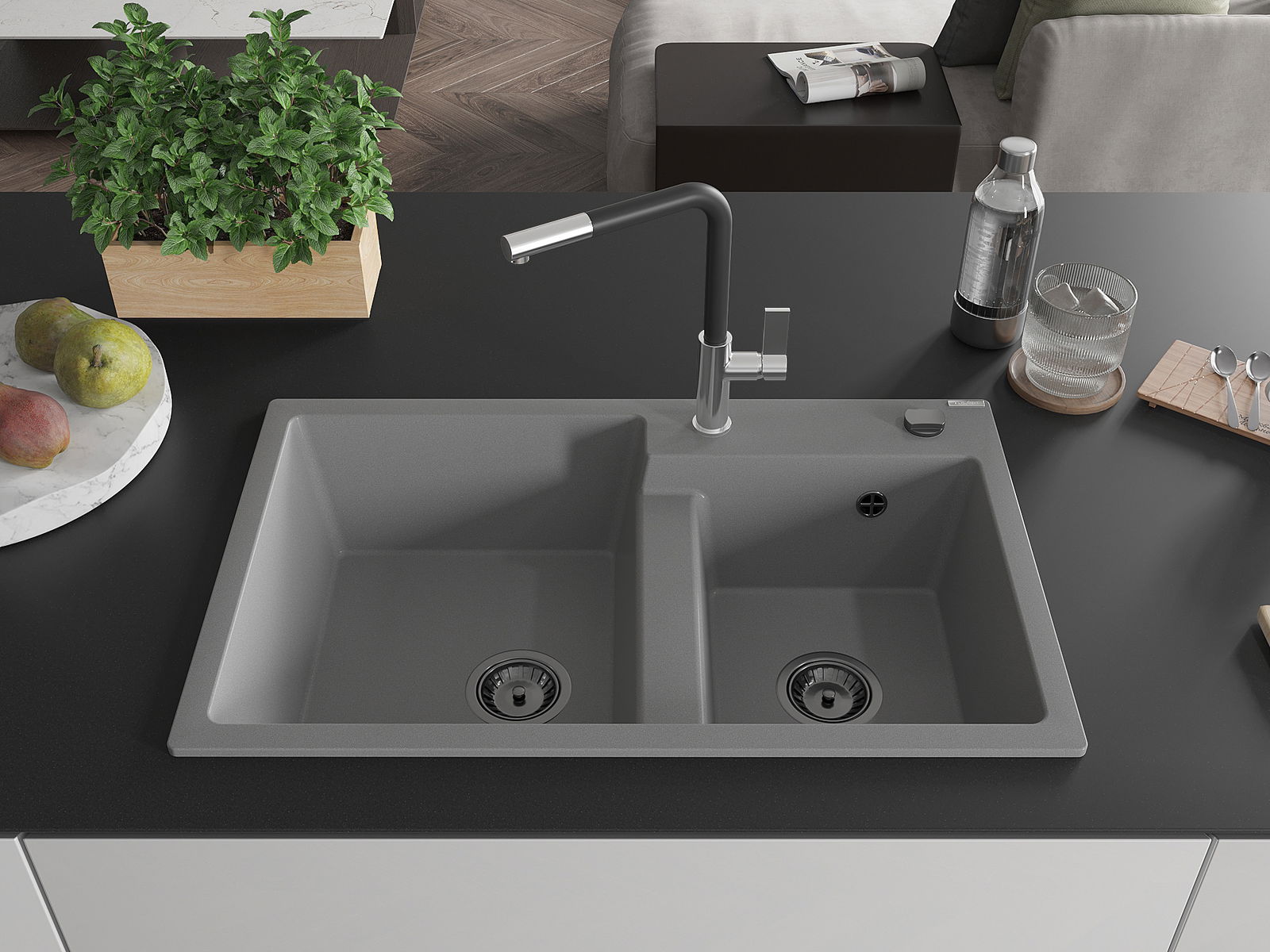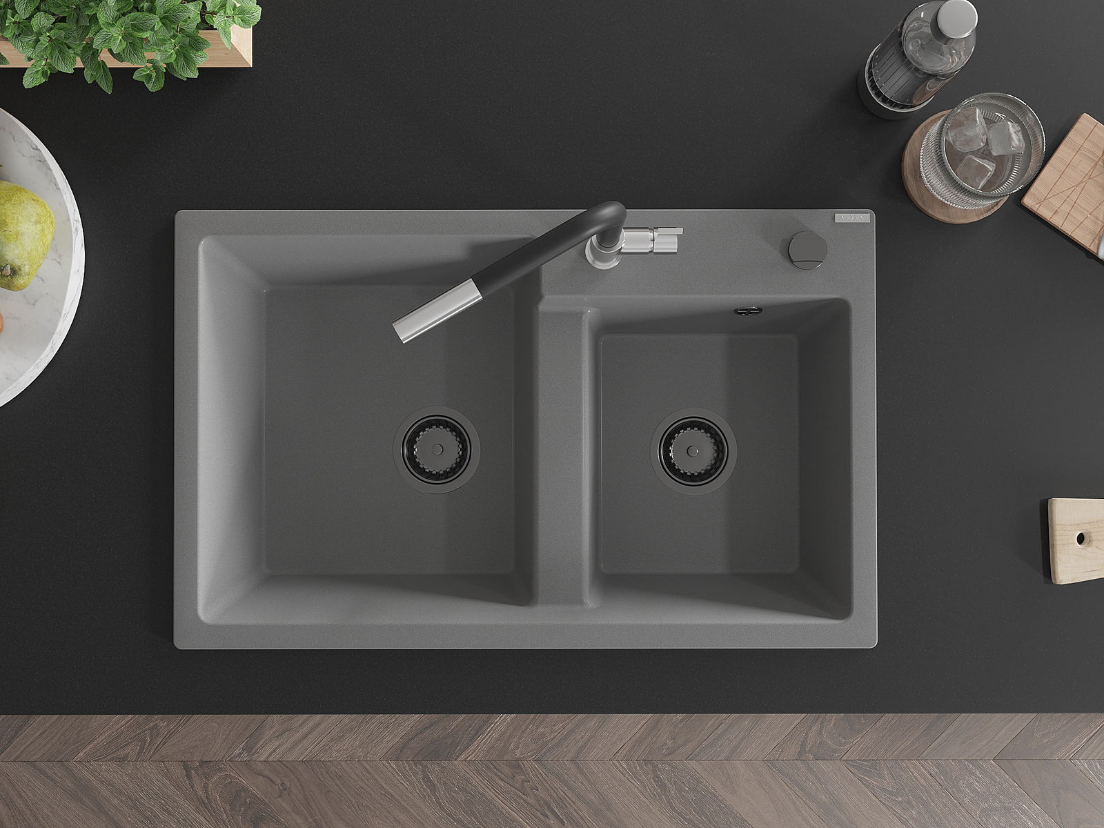 Mexen Tomas granīta virtuves izlietne ar 2 nodalījumiem un Flora virtuves jaucējkrānu, pelēka - 6516-71-670401-07-B
