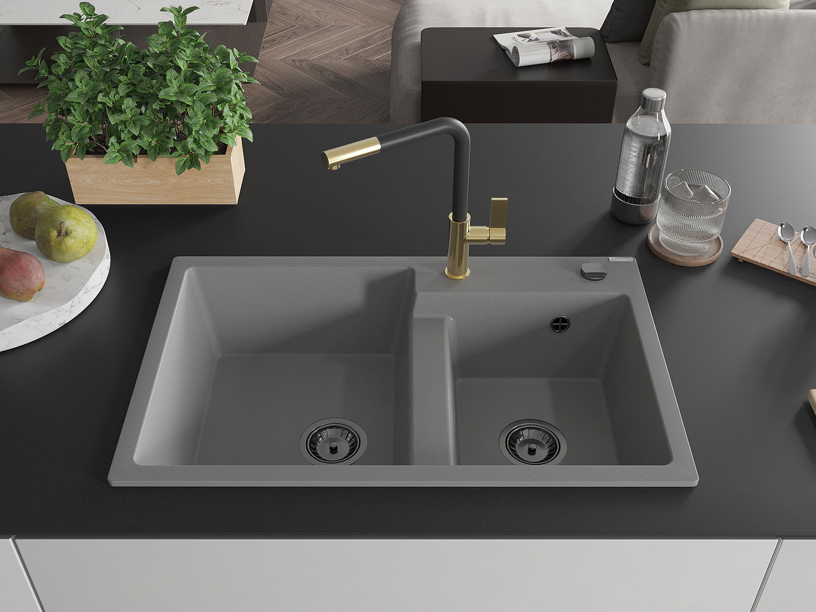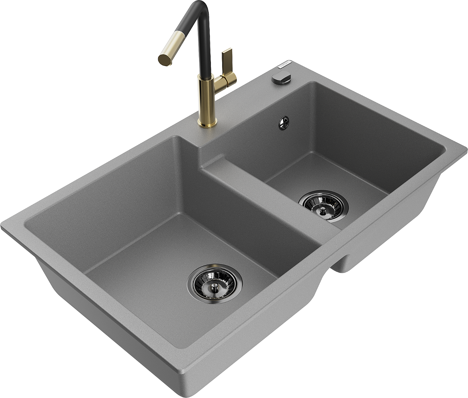 Mexen Tomas granitā izlietne ar 2 nodalījumiem un virtuves jaucējkrānu Flora, pelēks - 6516-71-670401-57-B
