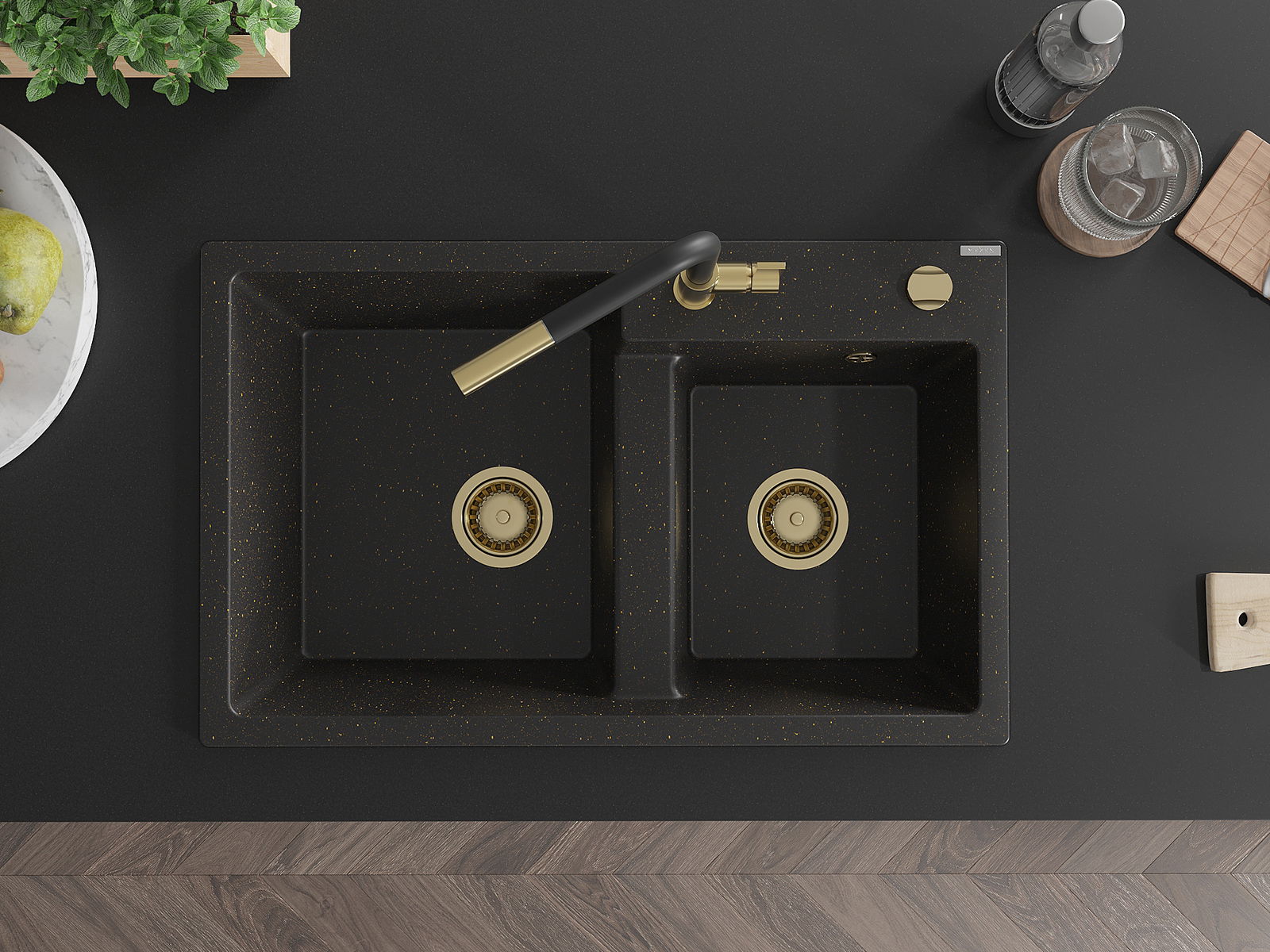 Mexen Tomas granitizlietnīgais izlietne ar 2 nodalījumiem ar virtuves jaucējkrānu Flora, melns/zeltīts