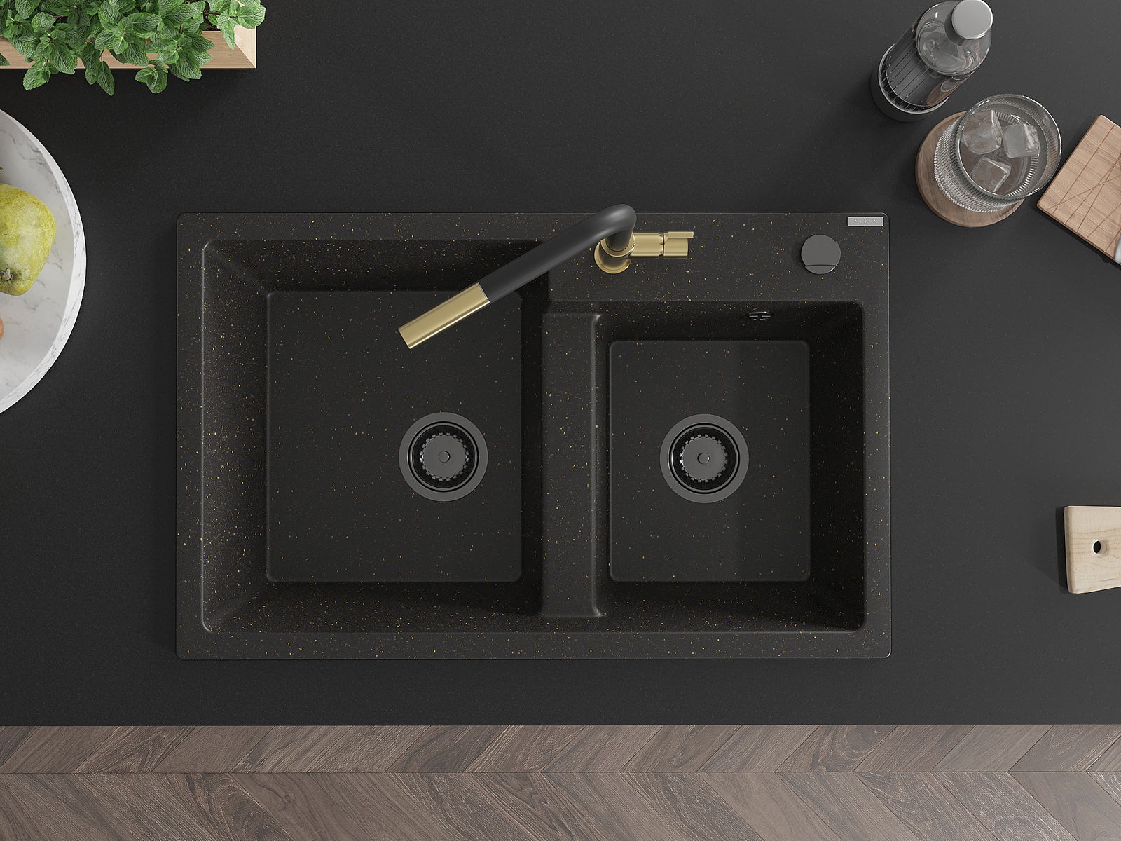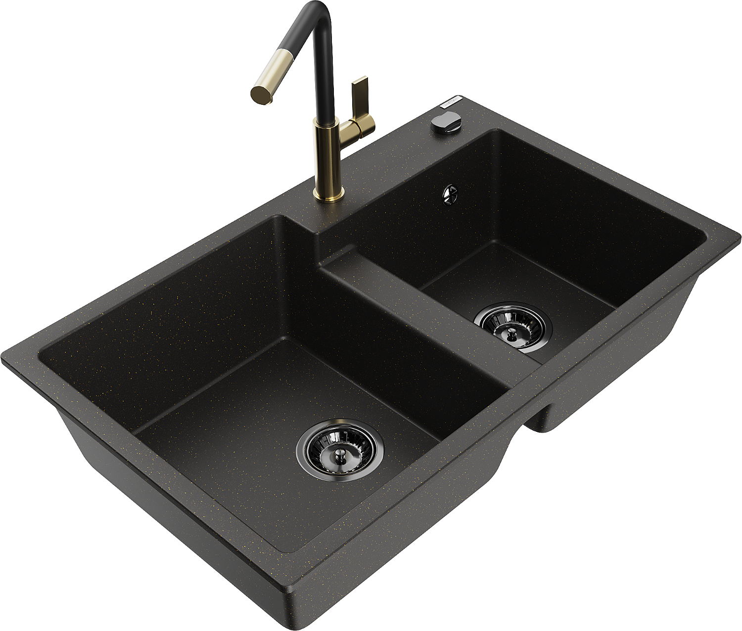 Mexen Tomas divkamera granīta 2-nodalījumu ar virtuves jaucējkrānu Flora, melns/zeltains metālisks - 6516-75-670401-57-B