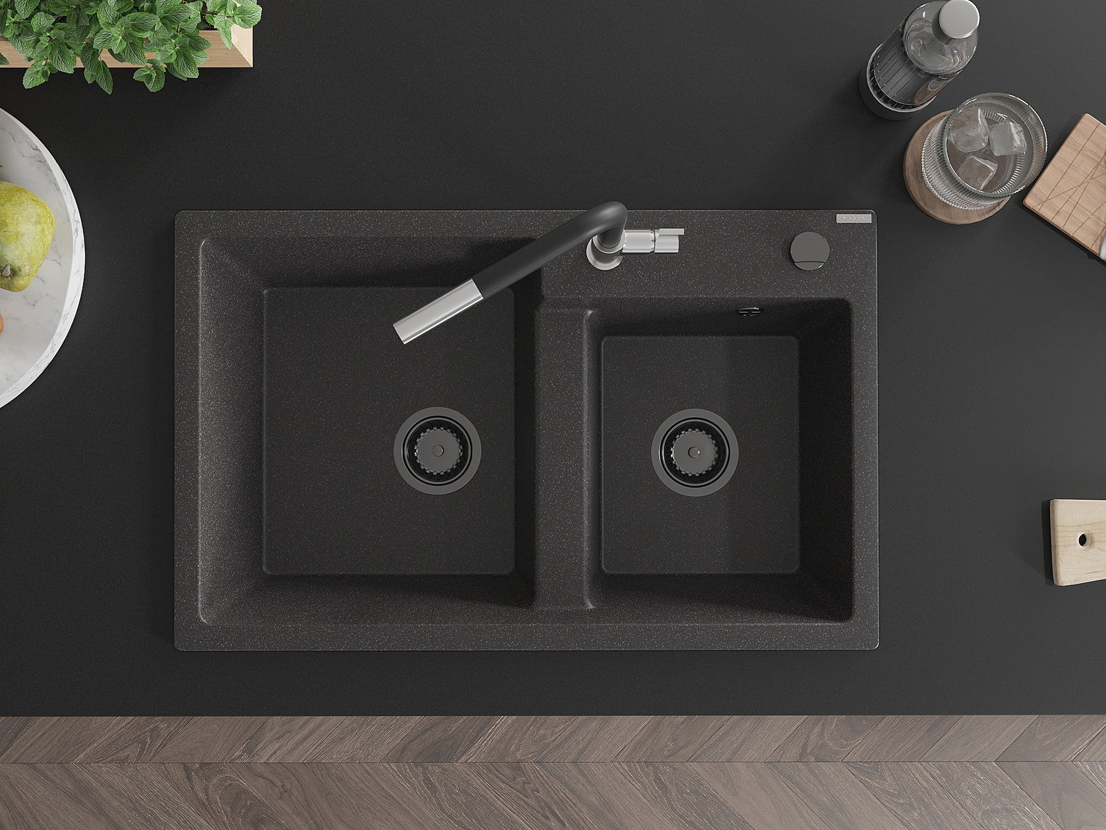 Mexen Tomas granitā izlietne ar divām kamerām un Flora virtuves jaucējkrānu, melna raibumaina - 6516-76-670401-07-B