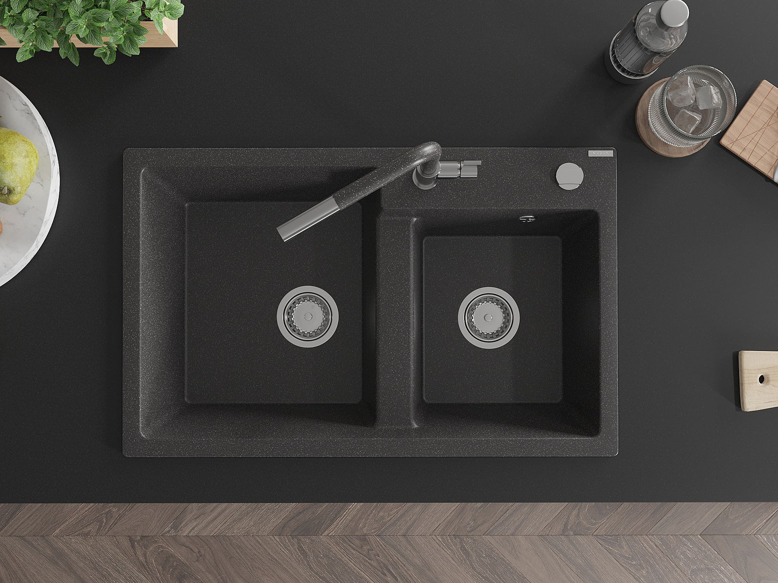 Mexen Tomas granit izlietne ar 2 nodalījumiem un virtuves jaucējkrānu Flora, melna ar plankumiem - 6516-76-670401-08