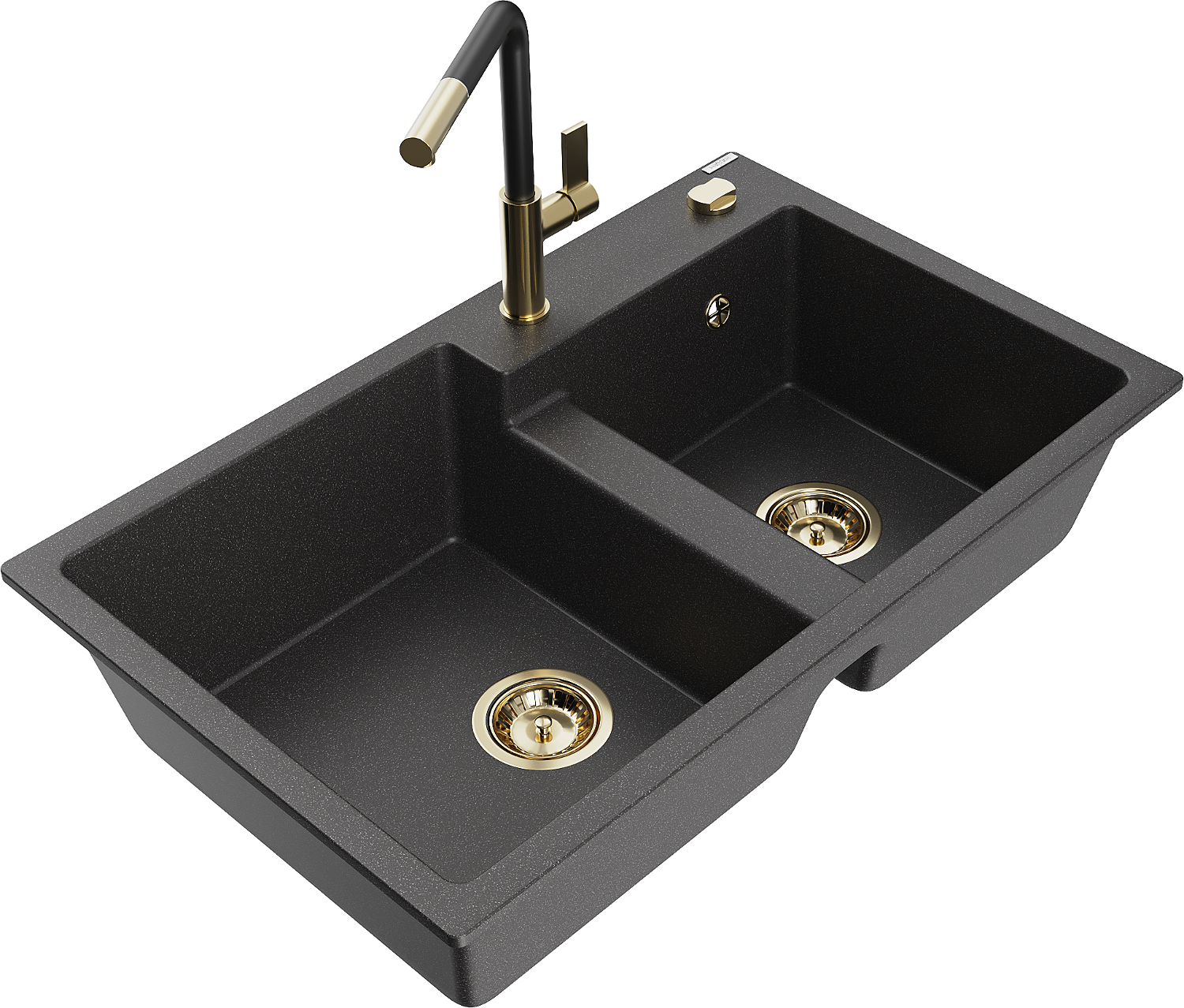 Mexen Tomas granīta divu nodalījumu izlietne ar Flora virtuves jaucējkrānu, melna ar plankumiem - 6516-76-670401-57-G
