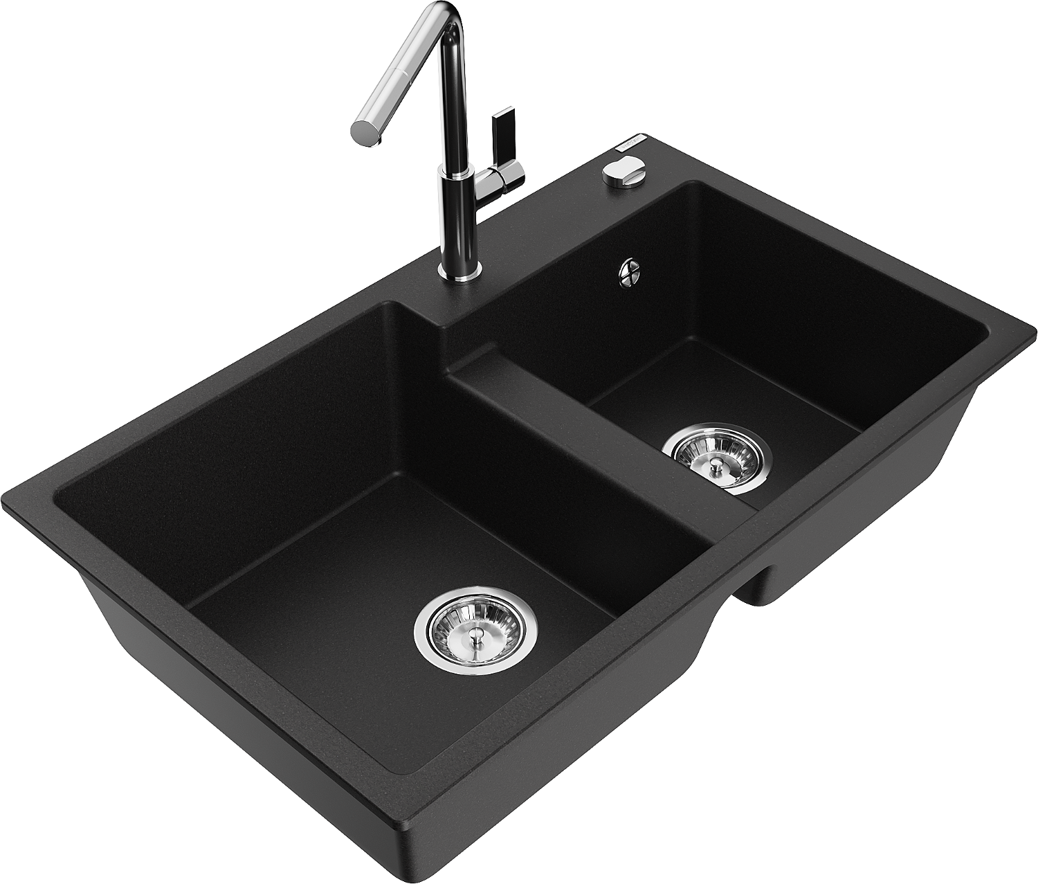 Mexen Tomas granit izlietne ar 2 nodalījumiem un virtuves jaucējkrānu Flora, melna - 6516-77-670401-00