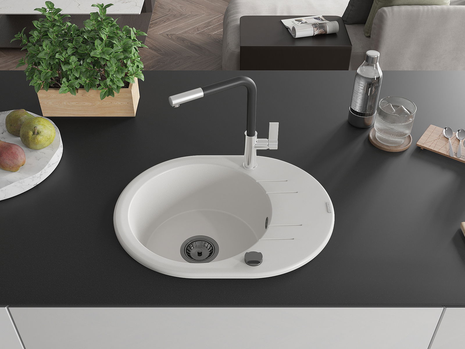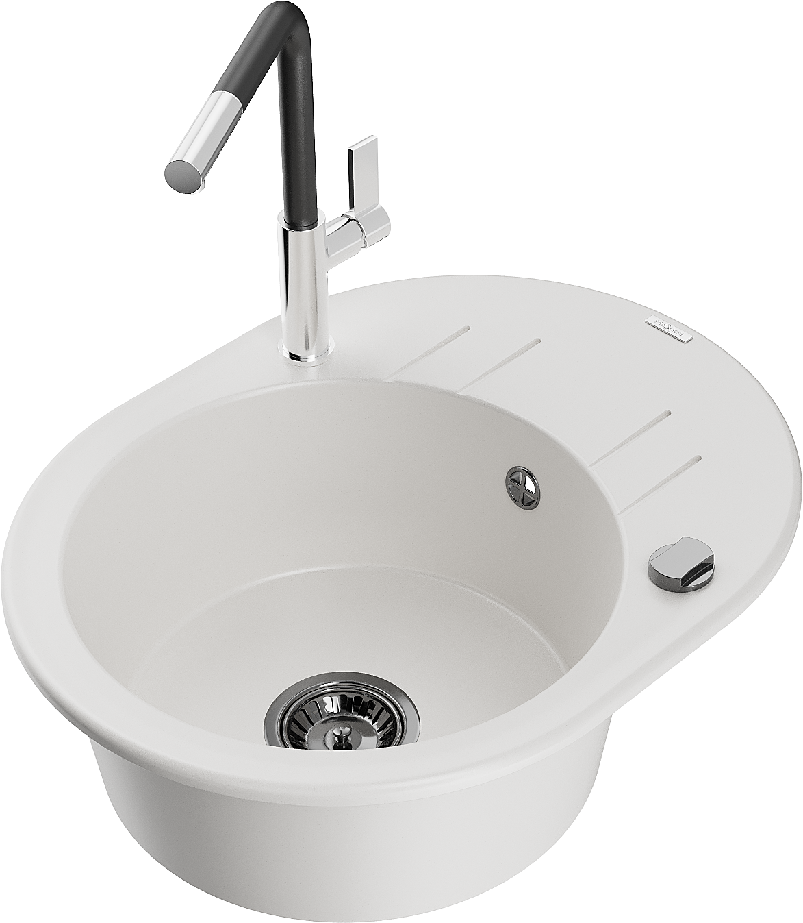 Mexen Kevin granīta izlietne ar vienu nodalījumu un noteces plati un virtuves jaucējkrānu Flora, balta - 6517-20-670401-07-B