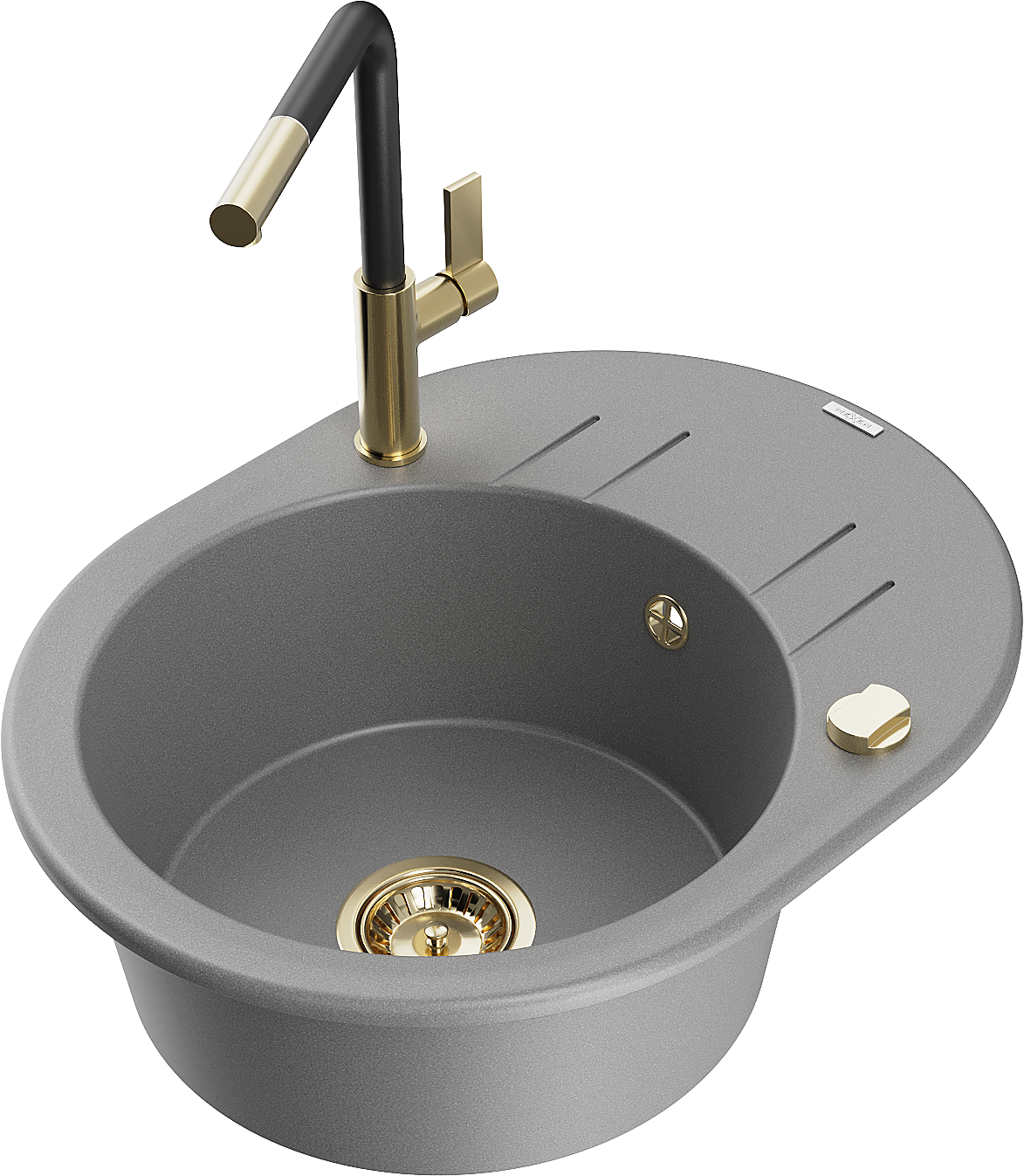 Mexen Kevin granitizlietne ar vienu nodalījumu, notecinātāju un virtuves jaucējkrānu Flora, pelēks - 6517-71-670401-57-G