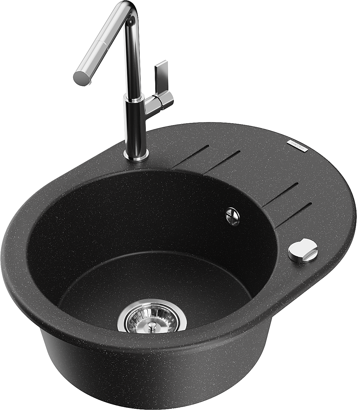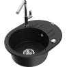 Mexen Kevin granitā izlietne ar vienu nodalījumu, notekpaplāti un virtuves jaucējkrānu Flora, melns/sudraba metāliks