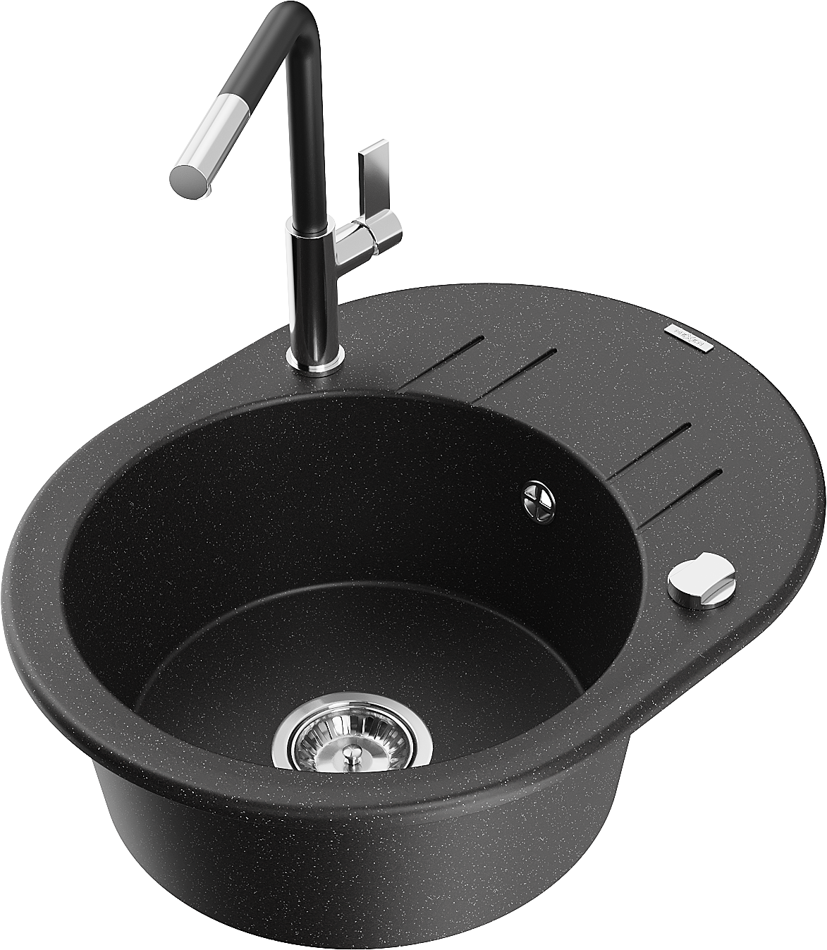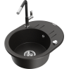 Mexen Kevin granitizlietne ar vienu nodalījumu un noteces zonu, un virtuves jaucējkrānu Flora, melna/sudraba metāliska