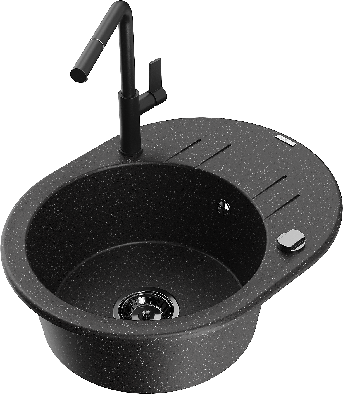 Mexen Kevin granitā izlietne ar vienu nodalījumu, noteces un virtuves jaucējkrānu Flora, melns/sudraba metālisks