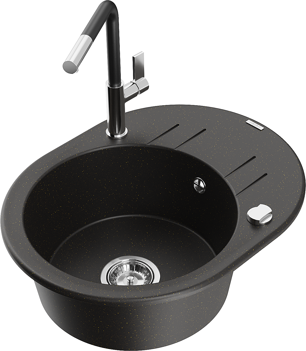 Mexen Kevin vienkameras granīta izlietne ar notekpaplāti un virtuves jaucējkrānu Flora, melns/zeltaini metālisks