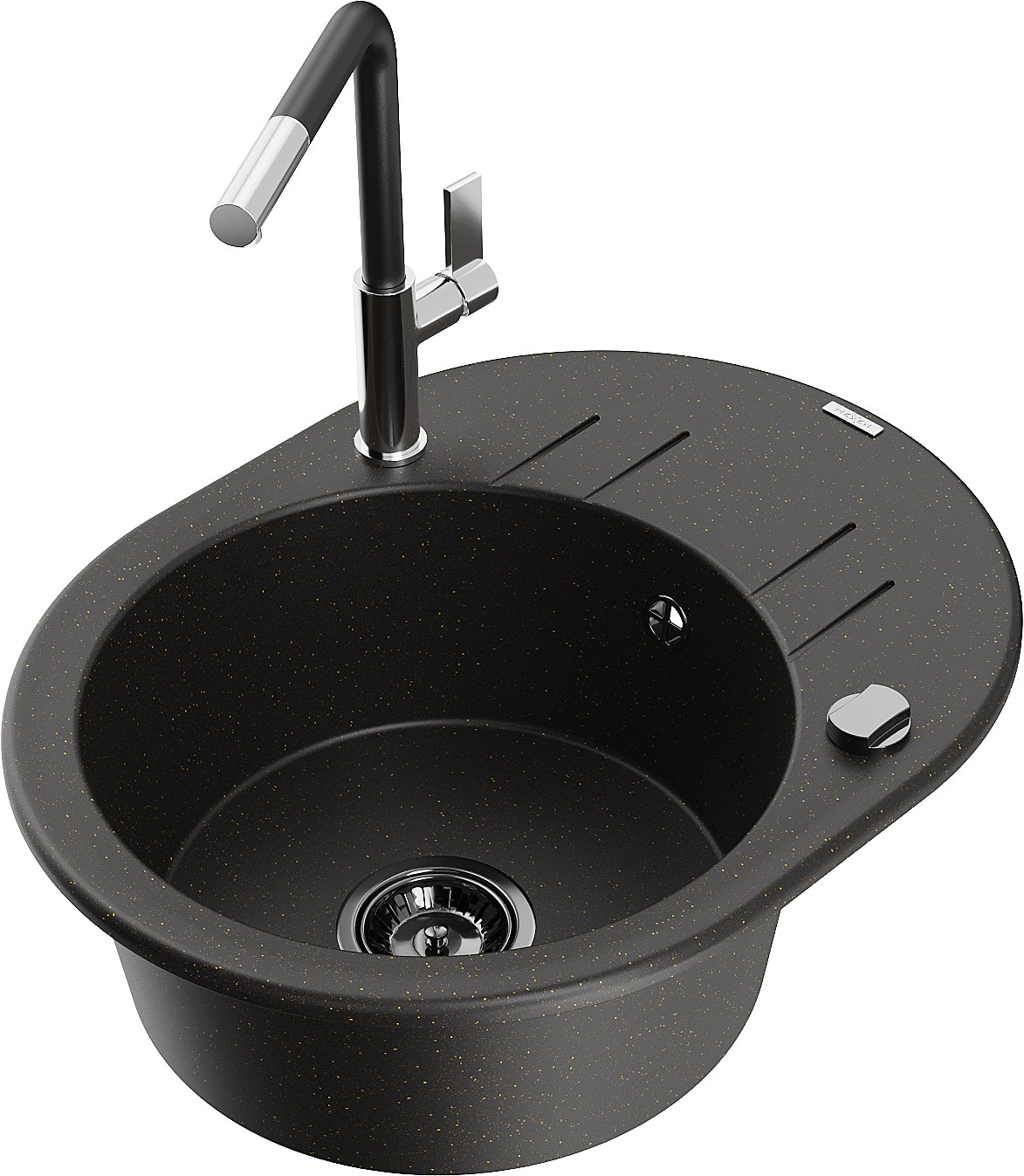 Mexen Kevin granitīgs izlietņu materiāls ar vienu nodalījumu, notekas paplāti un virtuves jaucējkrānu Flora,