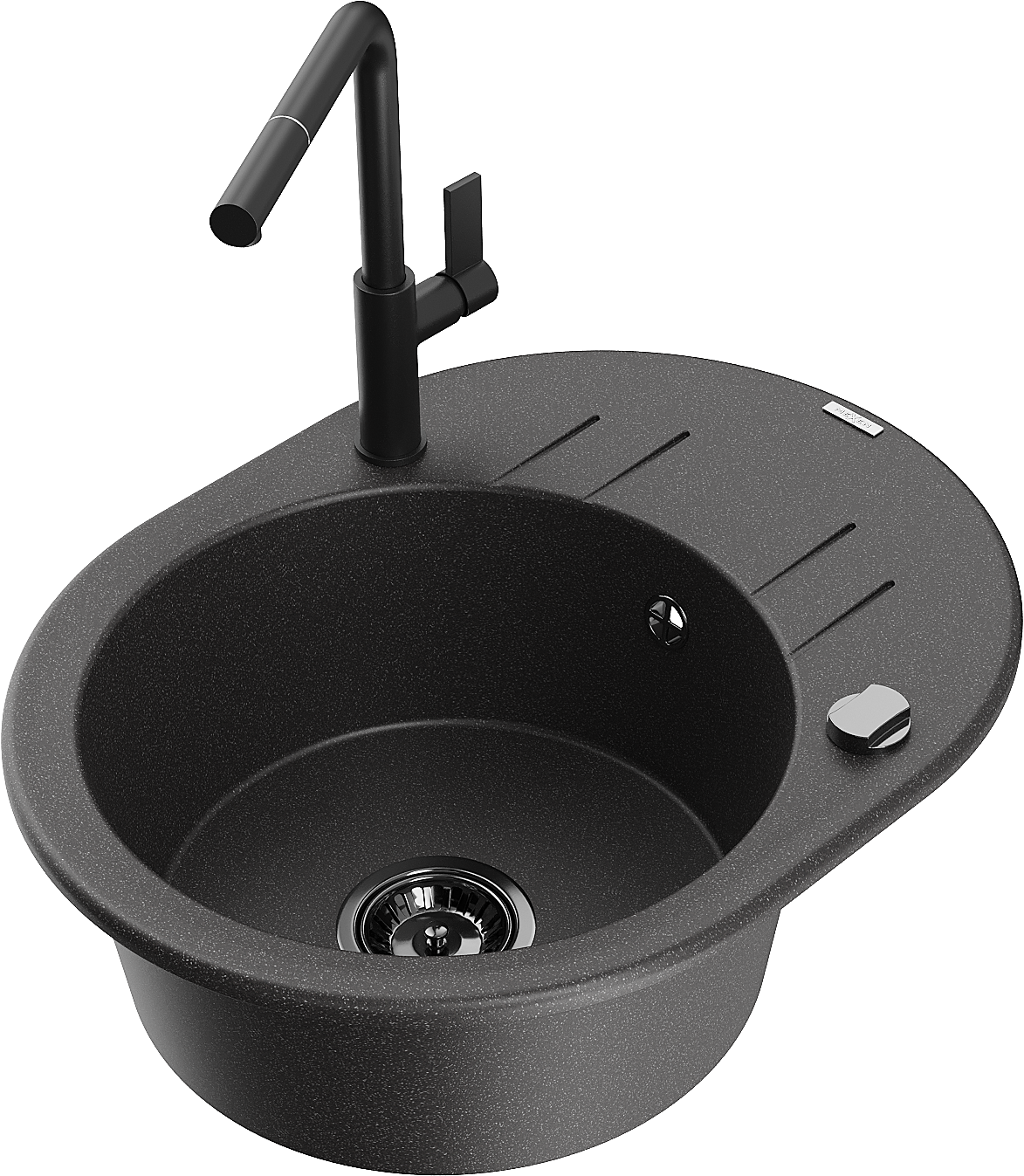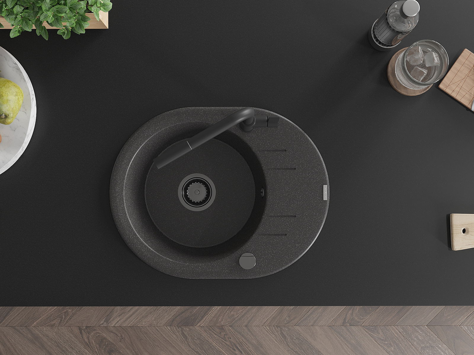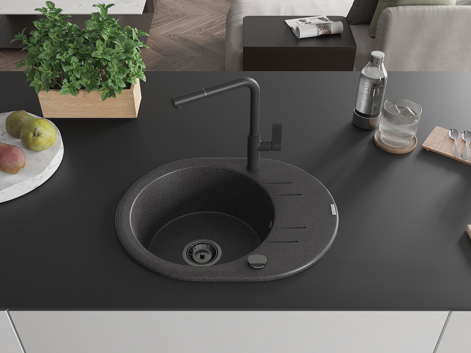 Mexen Kevin granīta izlietne ar vienu kameru un noteces laukumu un virtuves jaucējkrānu Flora, melna raiba - 6517-76-670401-70-B