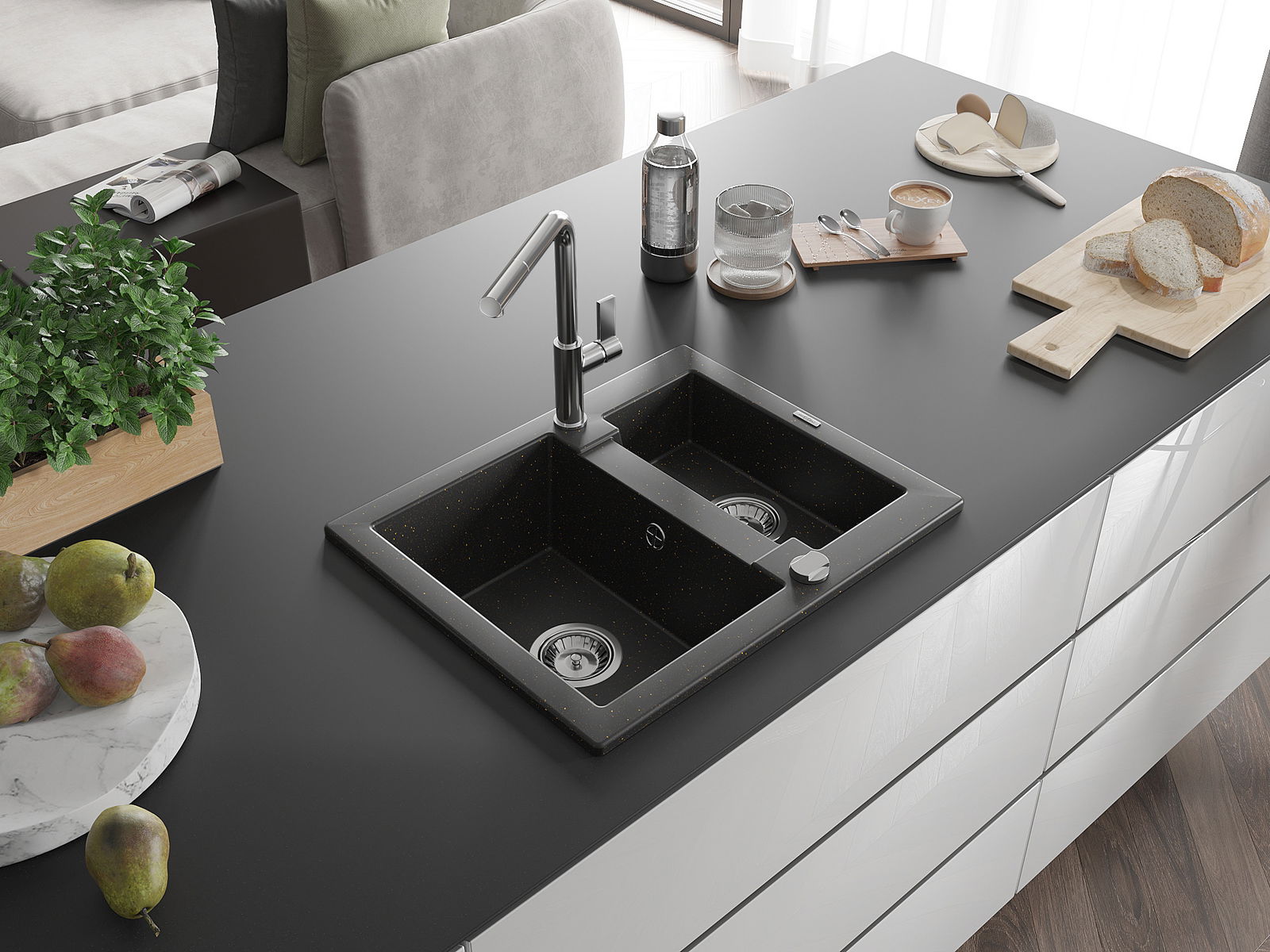 Mexen Carlos granitā izlietne ar 1,5 nodalījumiem un Flora virtuves jaucējkrānu, melna/zelta metāliska - 6518-75-670401-00