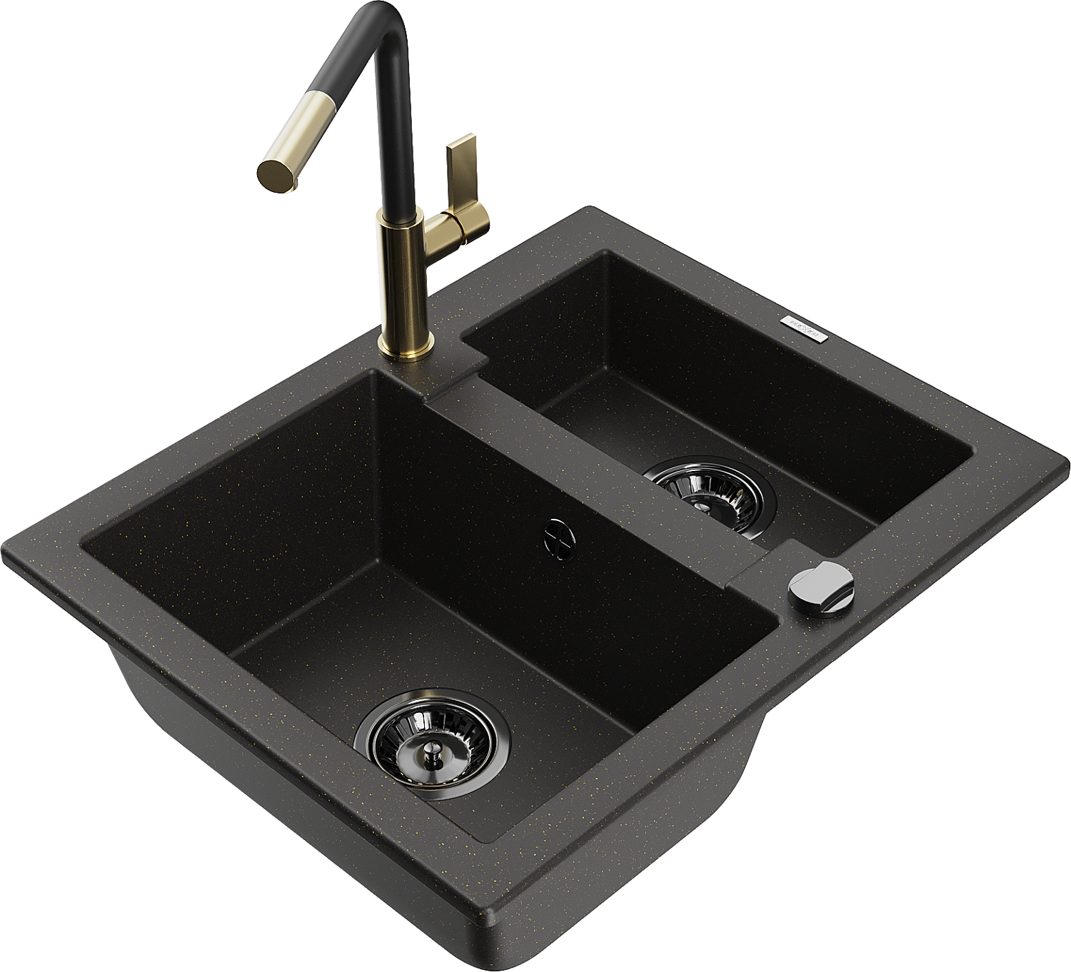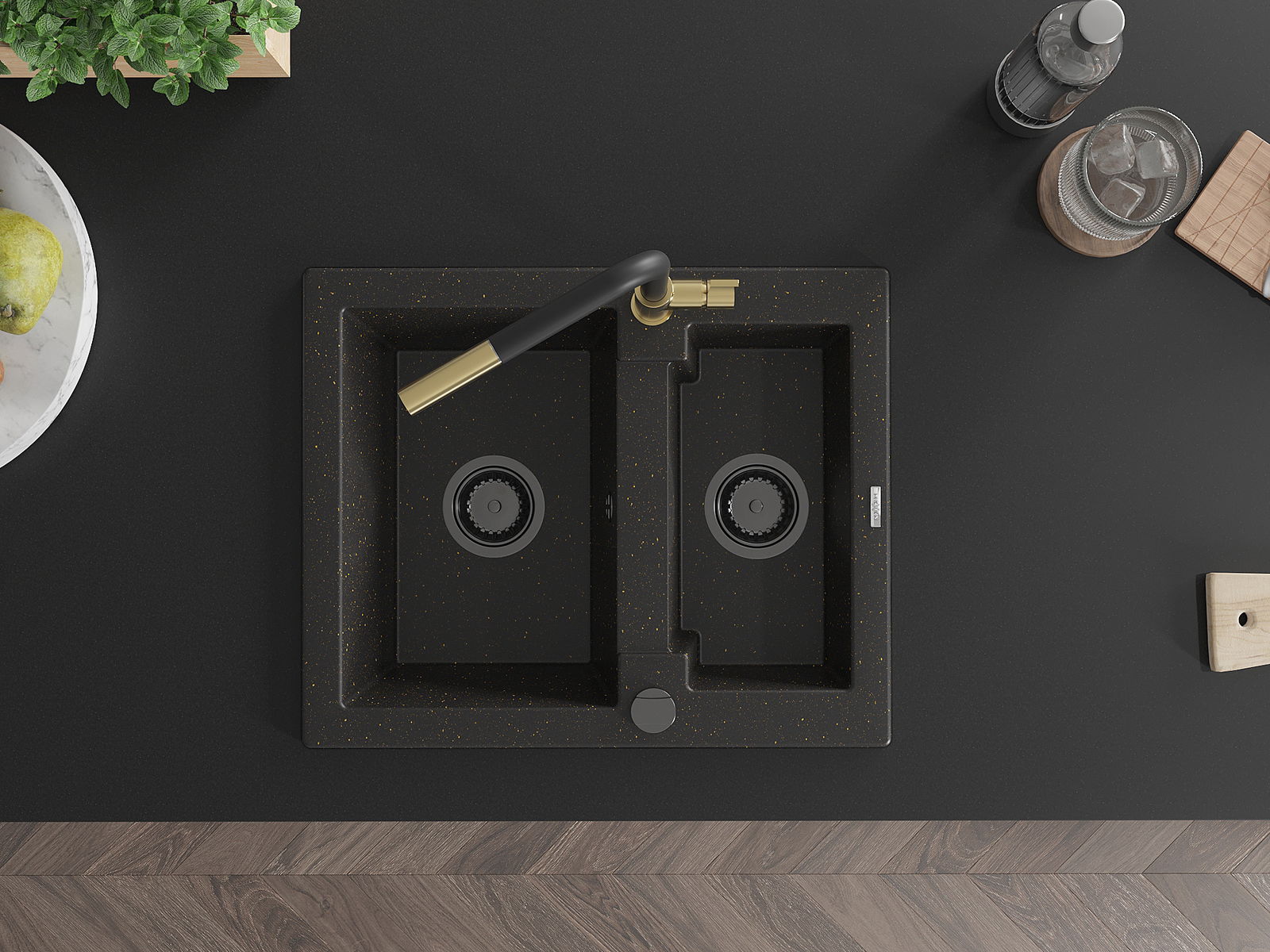 Mexen Carlos granitē izlietne ar 1,5 sekcijām un virtuves jaucējkrānu Flora, melns/zeltains metāliskais - 6518-75-670401-57-B