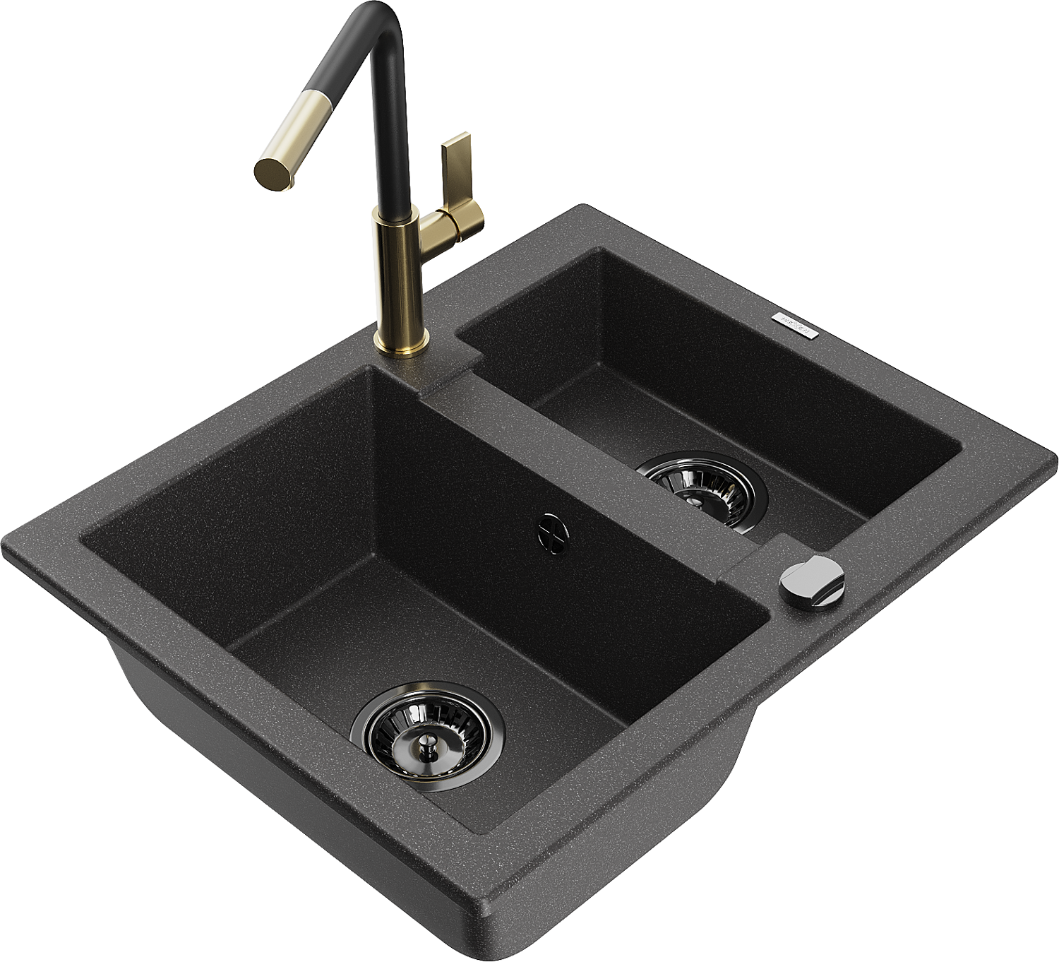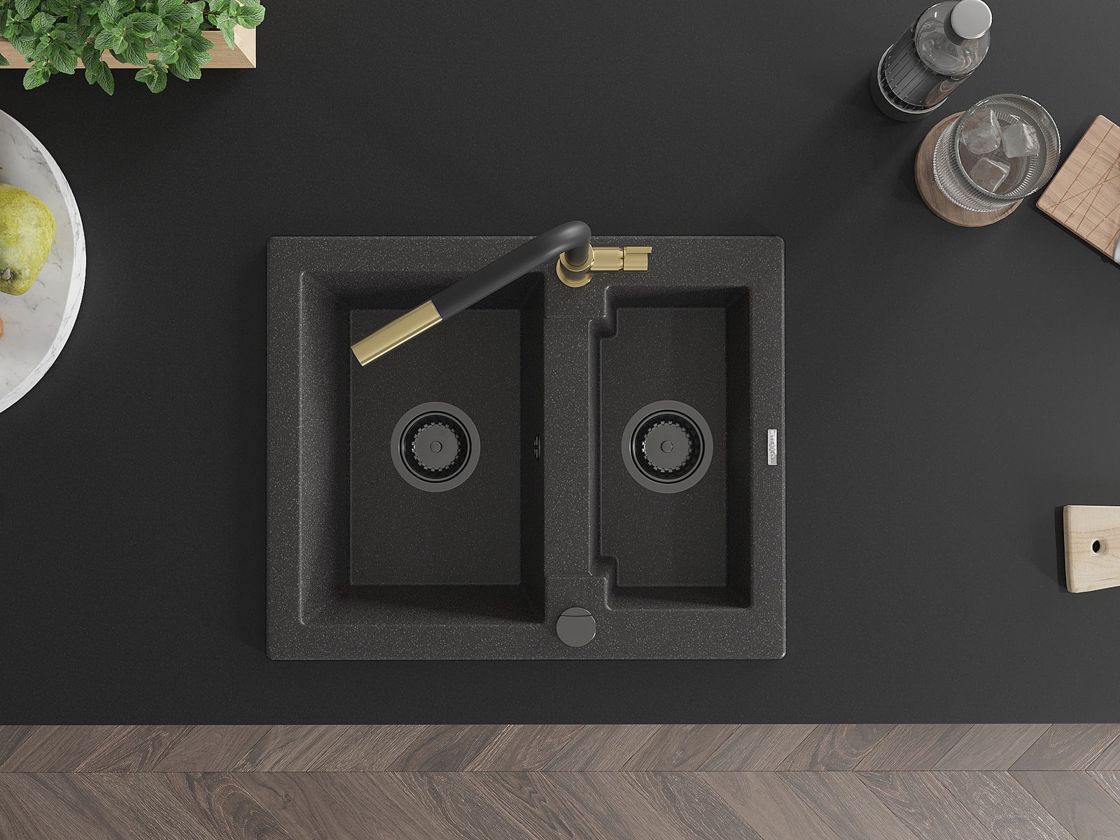 Mexen Carlos granitais izlietne 1,5-kameru ar virtuves jaucējkrānu Flora, melns ar akcentiem - 6518-76-670401-57-B