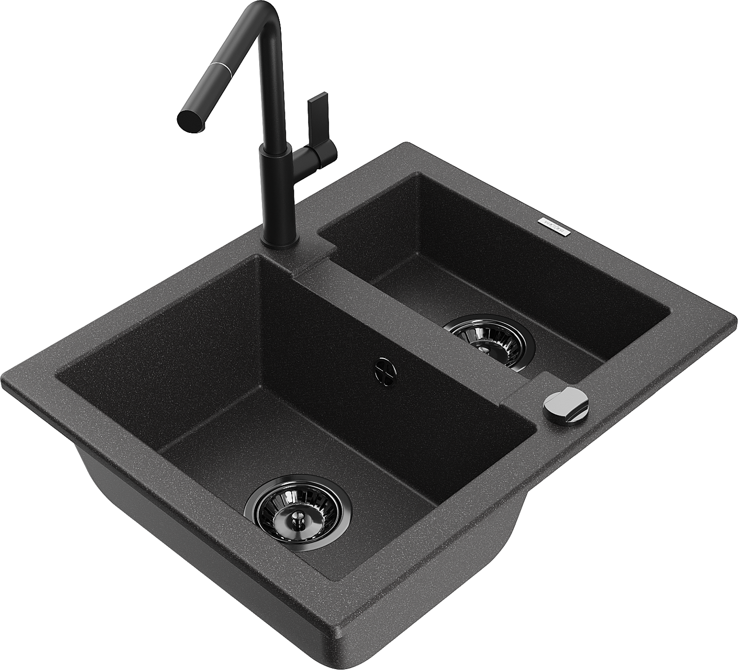 Mexen Carlos granitizlietnis 1,5 nodalījums ar virtuves jaucējkrānu Flora, melns ar plankumiem - 6518-76-670401-70-B