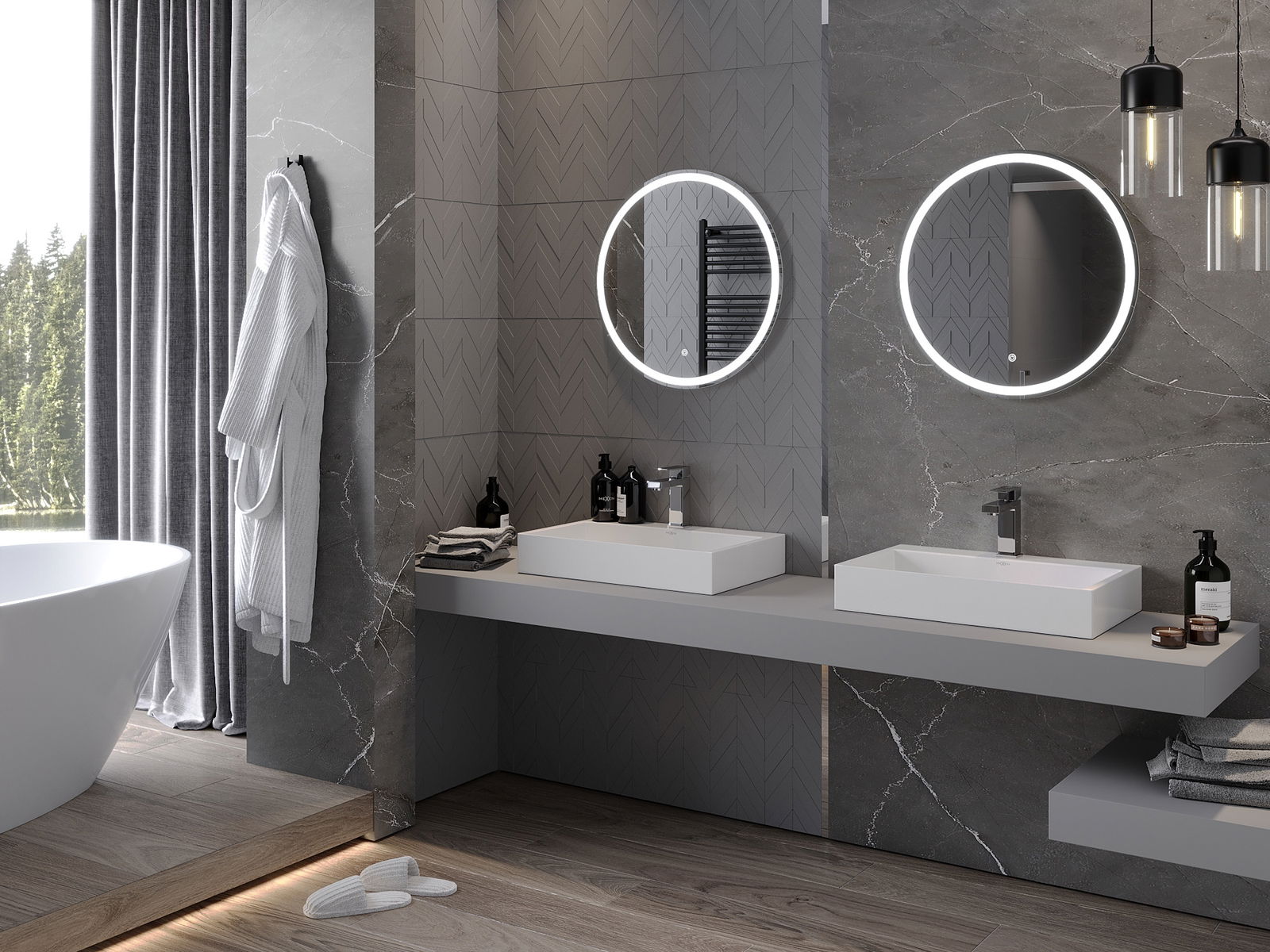 LED apgaismojums pie spoguļa ir praktisks elements, kas atvieglo ikdienas kopšanu un sniedz iespēju ideāli apgaismot seju. Apgaismojums piešķir vannasistabai modernu apdari, akcentējot tās eleganto interjeru.