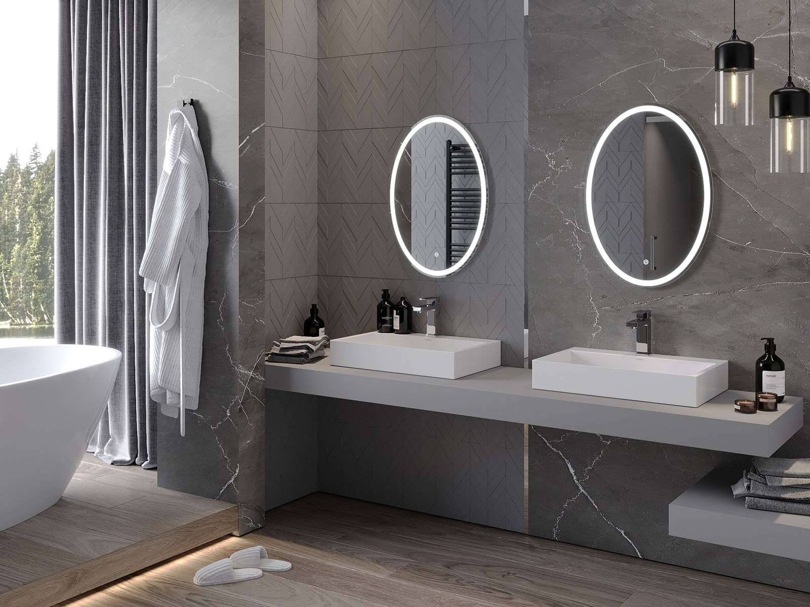 LED apgaismojums pie spoguļa ir praktisks elements, kas atvieglo ikdienas kopšanu un sniedz iespēju ideāli apgaismot seju. Apgaismojums piešķir vannasistabai modernu apdari, akcentējot tās eleganto interjeru.