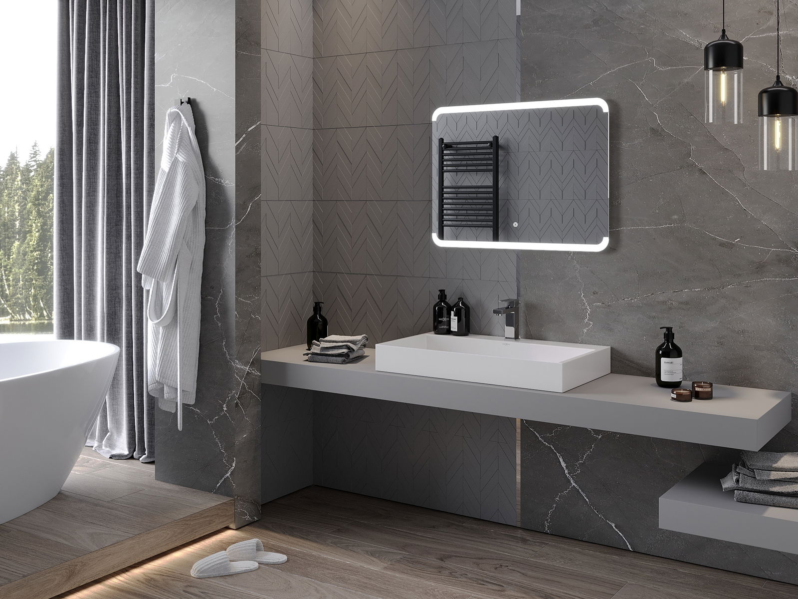 LED apgaismojums pie spoguļa ir praktisks elements, kas atvieglo ikdienas kopšanu un sniedz iespēju ideāli apgaismot seju. Apgaismojums piešķir vannasistabai modernu apdari, akcentējot tās eleganto interjeru.