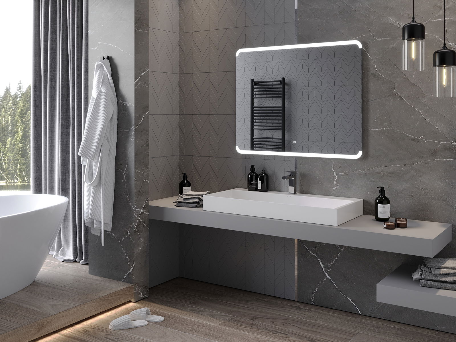 LED apgaismojums pie spoguļa ir praktisks elements, kas atvieglo ikdienas kopšanu un sniedz iespēju ideāli apgaismot seju. Apgaismojums piešķir vannasistabai modernu apdari, akcentējot tās eleganto interjeru.