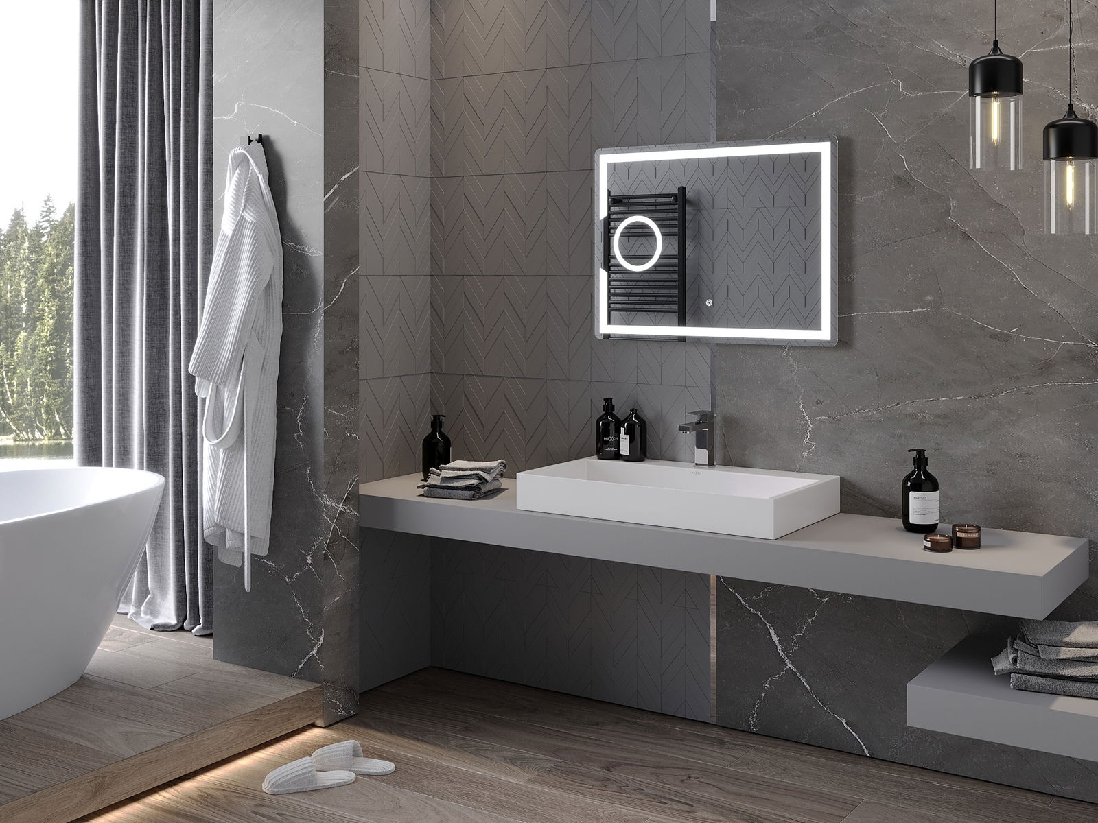LED apgaismojums pie spoguļa ir praktisks elements, kas atvieglo ikdienas kopšanu un sniedz iespēju ideāli apgaismot seju. Apgaismojums piešķir vannasistabai modernu apdari, akcentējot tās eleganto interjeru.