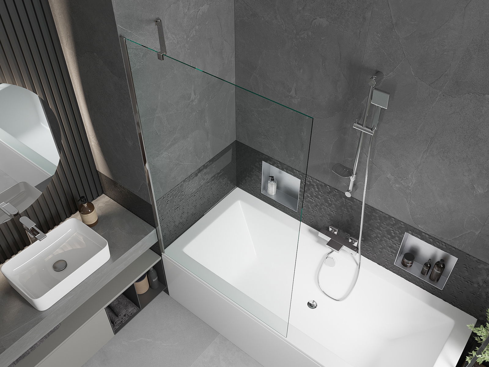 Efektīva aizsardzība pret ūdens izšļakstīšanos peldēšanās laikā. Ekrānam ir blīves, kas ideāli pielāgojas stikla virsmai un vannas malai. Funkcionāls risinājums, kas nodrošina drošību un vieglu tīrību.