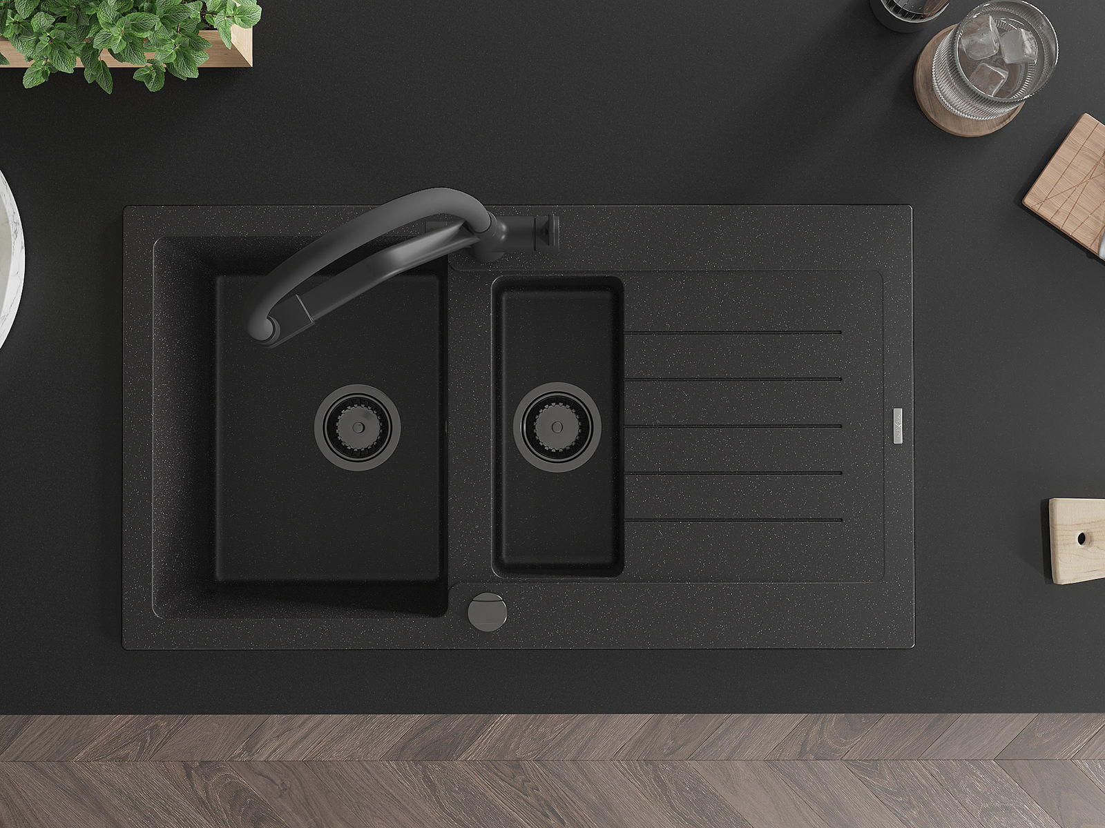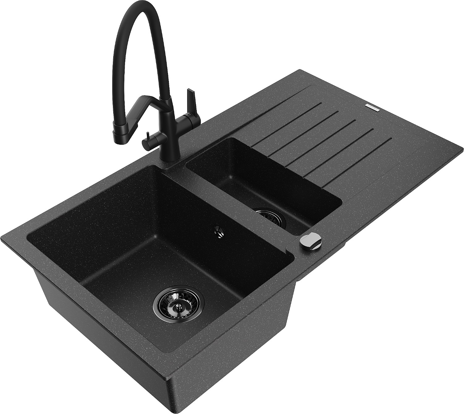 Mexen Matias granitizlietne izlietne ar 1,5 nodalījumu, drenāžas virsmu un Duo virtuves jaucējkrānu, melns/sudrabs