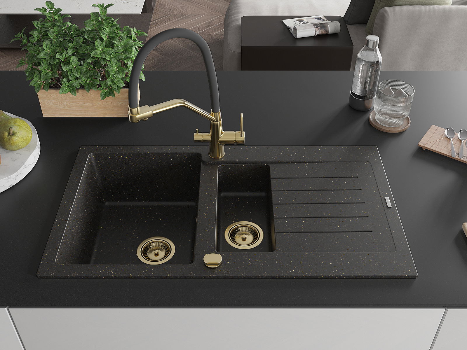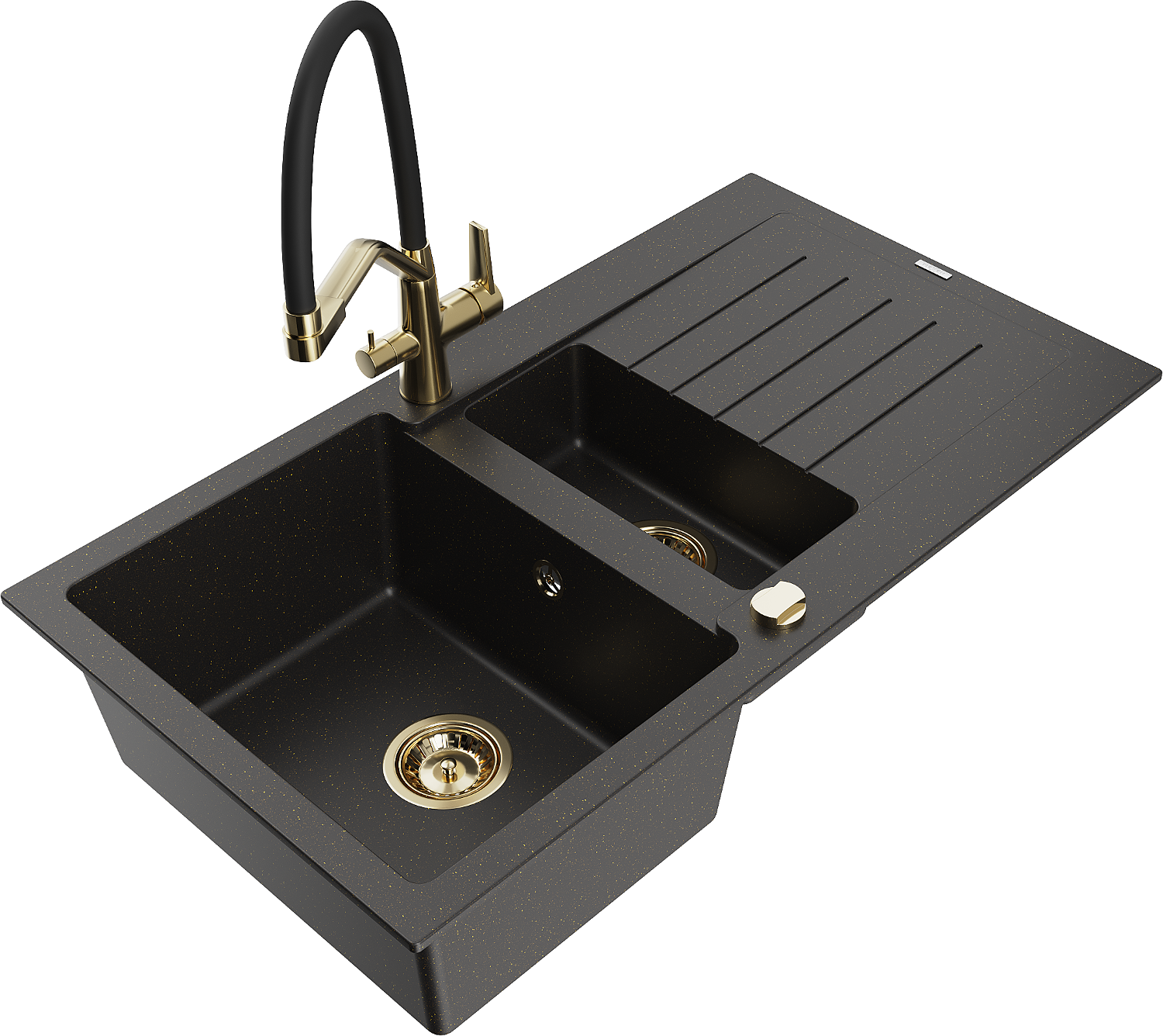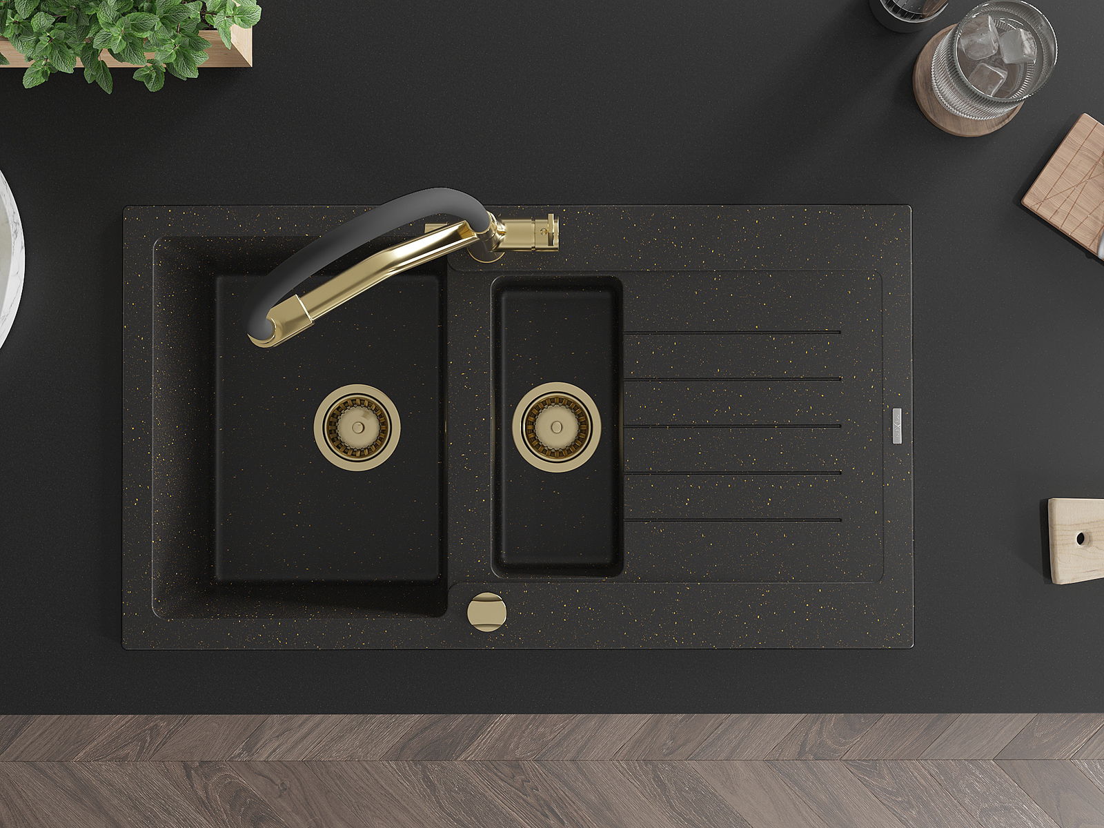 Mexen Matias grants izlietne 1,5 nodalījumu ar noteci un virtuves jaucējkrānu Duo, melns/zeltains metālisks