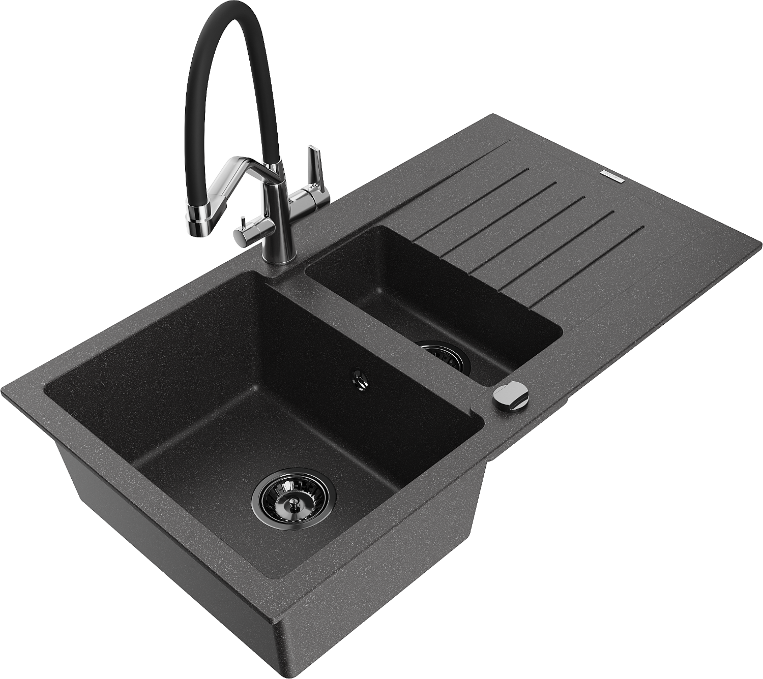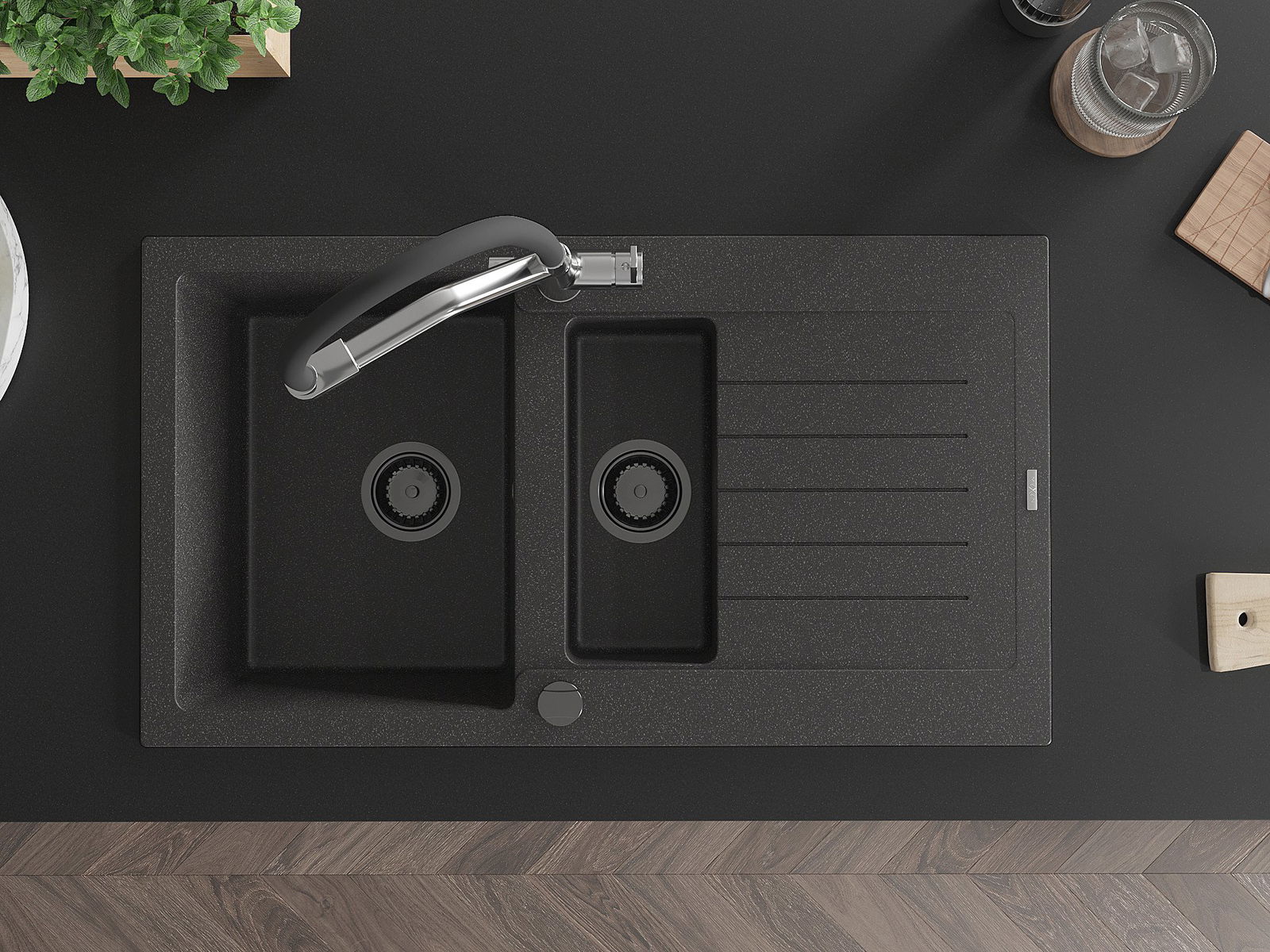 Mexen Matias granīta 1,5 nodalījumu izlietne ar noteci un Duo virtuves jaucējkrānu, melna ar punktiem - 6502-76-671701-07-B