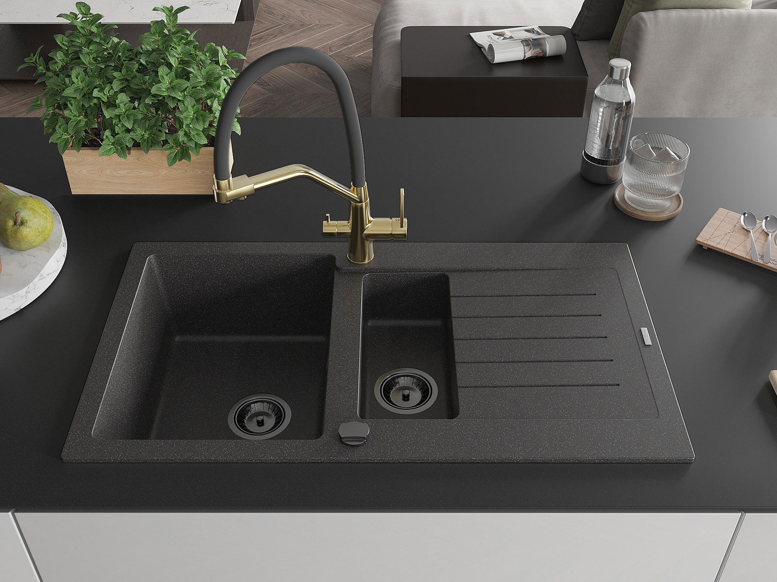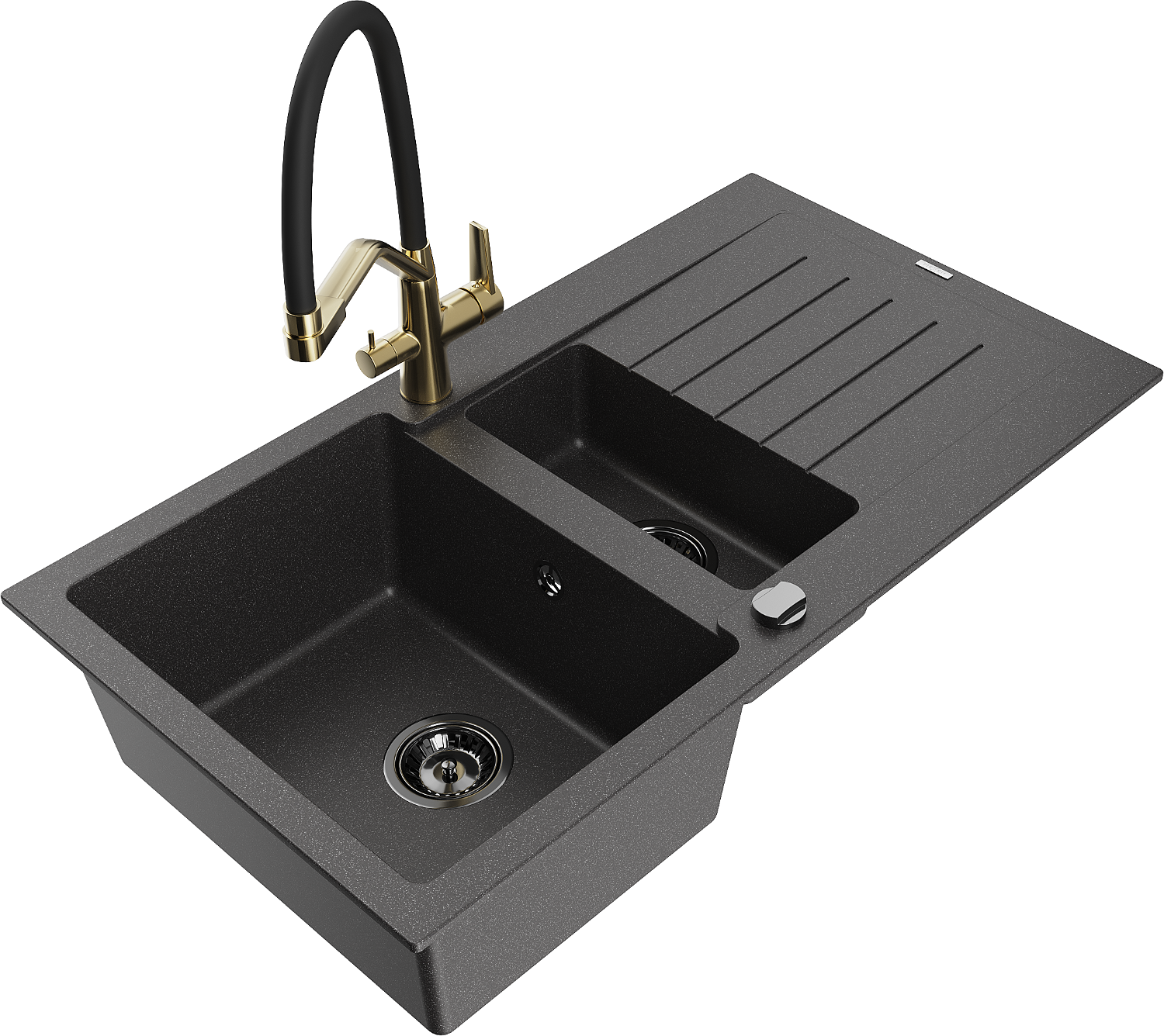 Mexen Matias 1,5 nodalījumu granīta izlietne ar notaku un Duo virtuves jaucējkrānu, melna raiba - 6502-76-671701-57-B