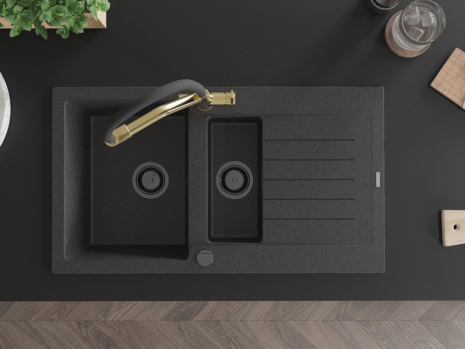 Izlietnei ir 2 daļēji izurbtas atveres ar diametru 35 mm, kuras var pašrocīgi izsist. Tās var izmantot, piemēram, šķidruma dozatora uzstādīšanai, kas novērsīs plastmasas pudeļu klātbūtni virtuvē un piešķirs tai elegantu apdari.