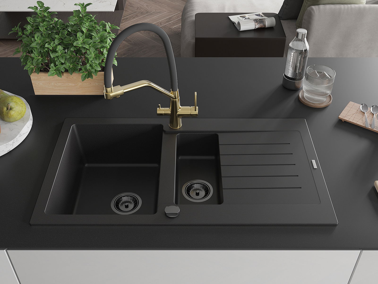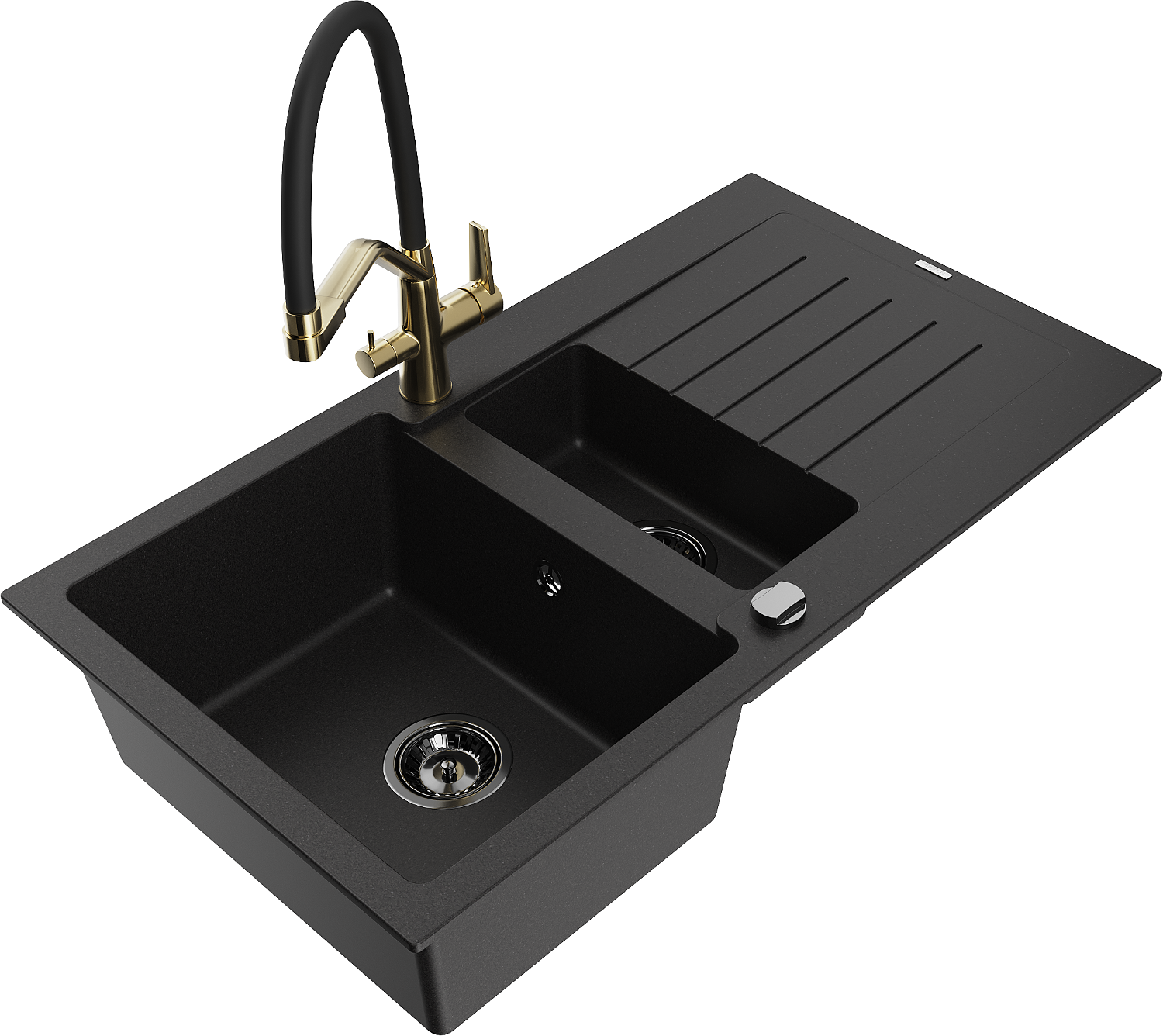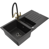 Mexen Matias granit izlietne ar 1,5 nodalījumu un noteces zonu un virtuves jaucējkrānu Duo, melna - 6502-77-671701-57-B