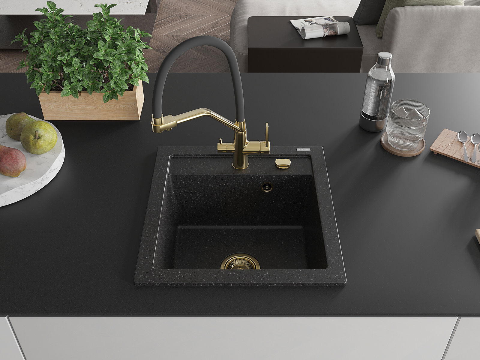 Izlietnei ir padziļināts caurums ar diametru 35 mm, kuru varat izsist patstāvīgi. To var izmantot, piemēram, šķidruma dozatora uzstādīšanai, kas novērsīs plastmasas pudeļu klātbūtni virtuvē un piešķirs tai elegantu apdari.
