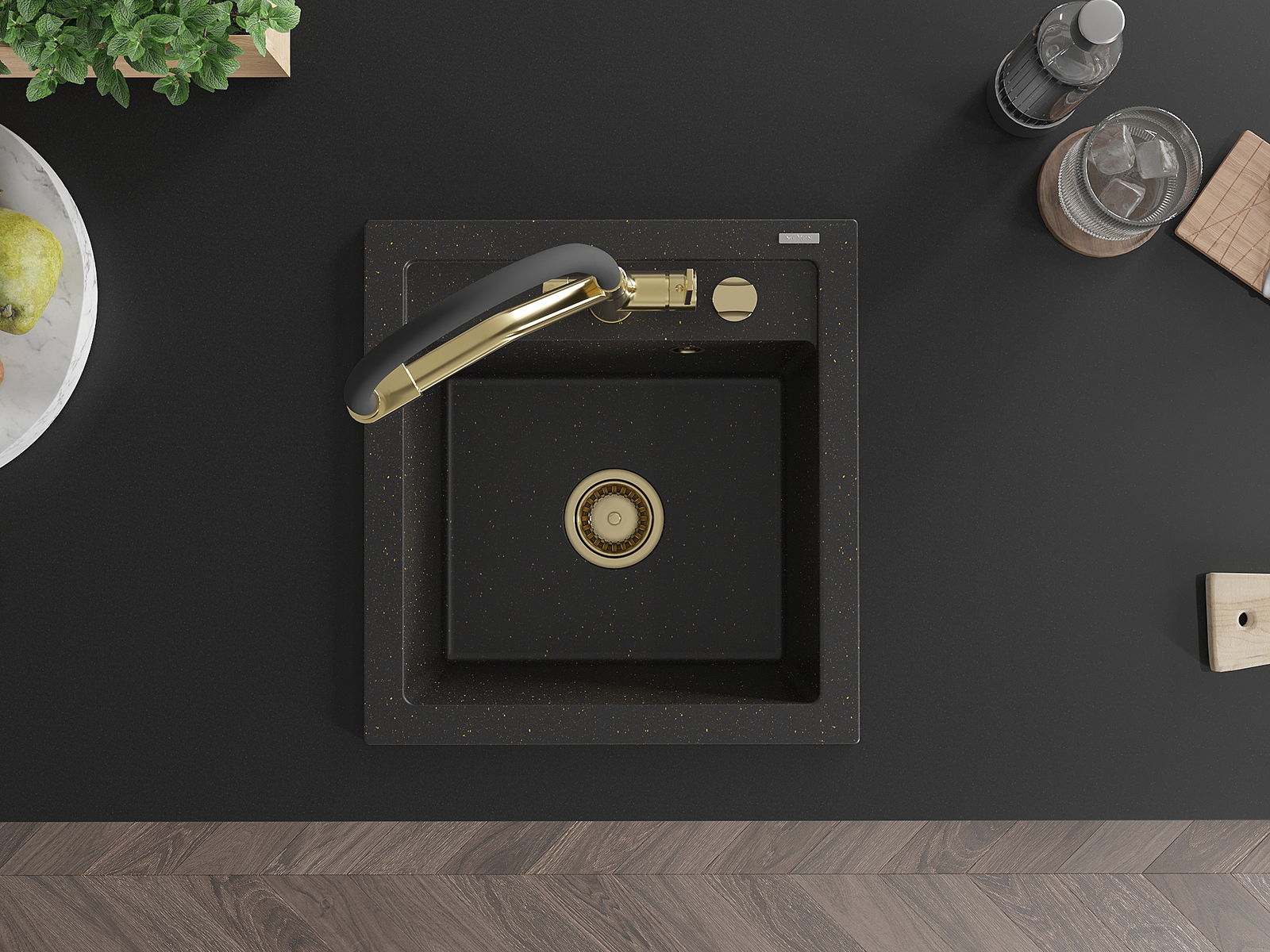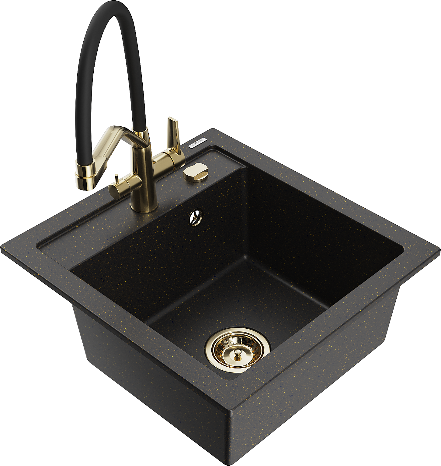 Mexen Vito granitē izlietne ar 1 nodalījumu un virtuves jaucējkrānu Duo, melns/zeltains metāliks - 6503-75-671701-57-G