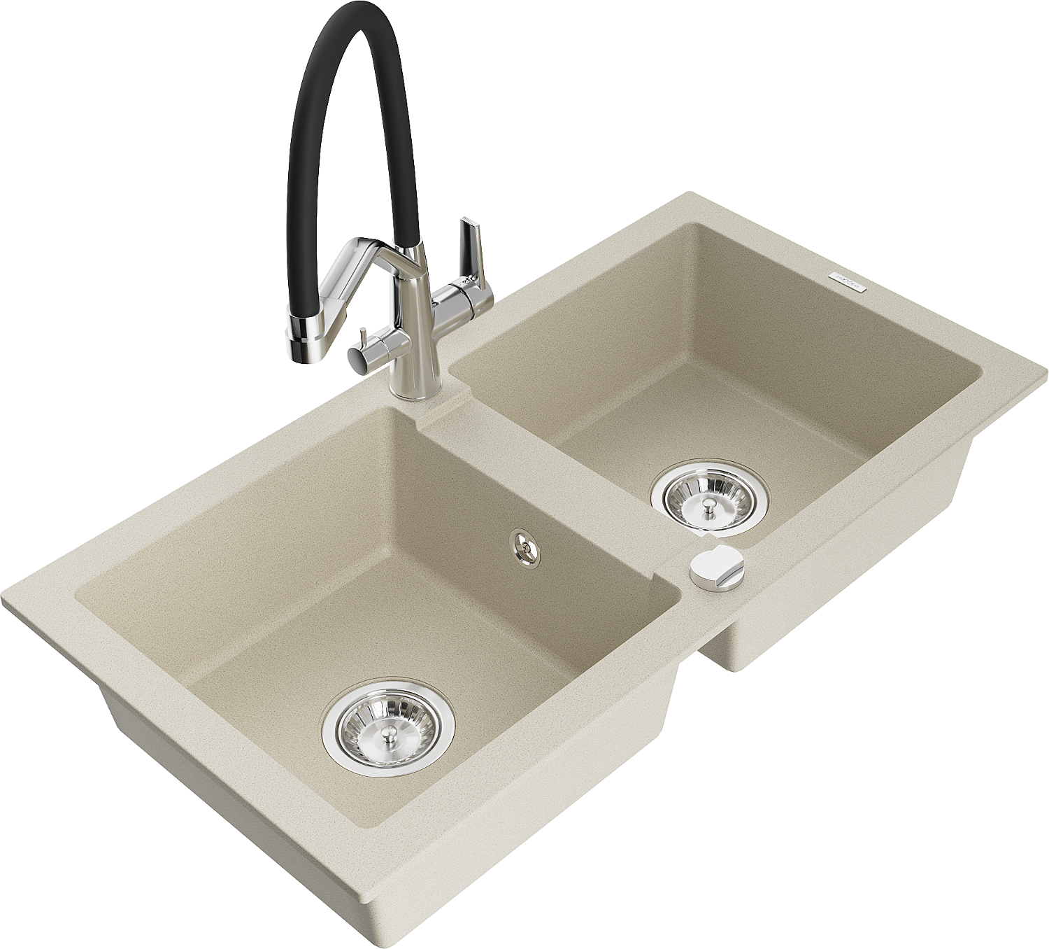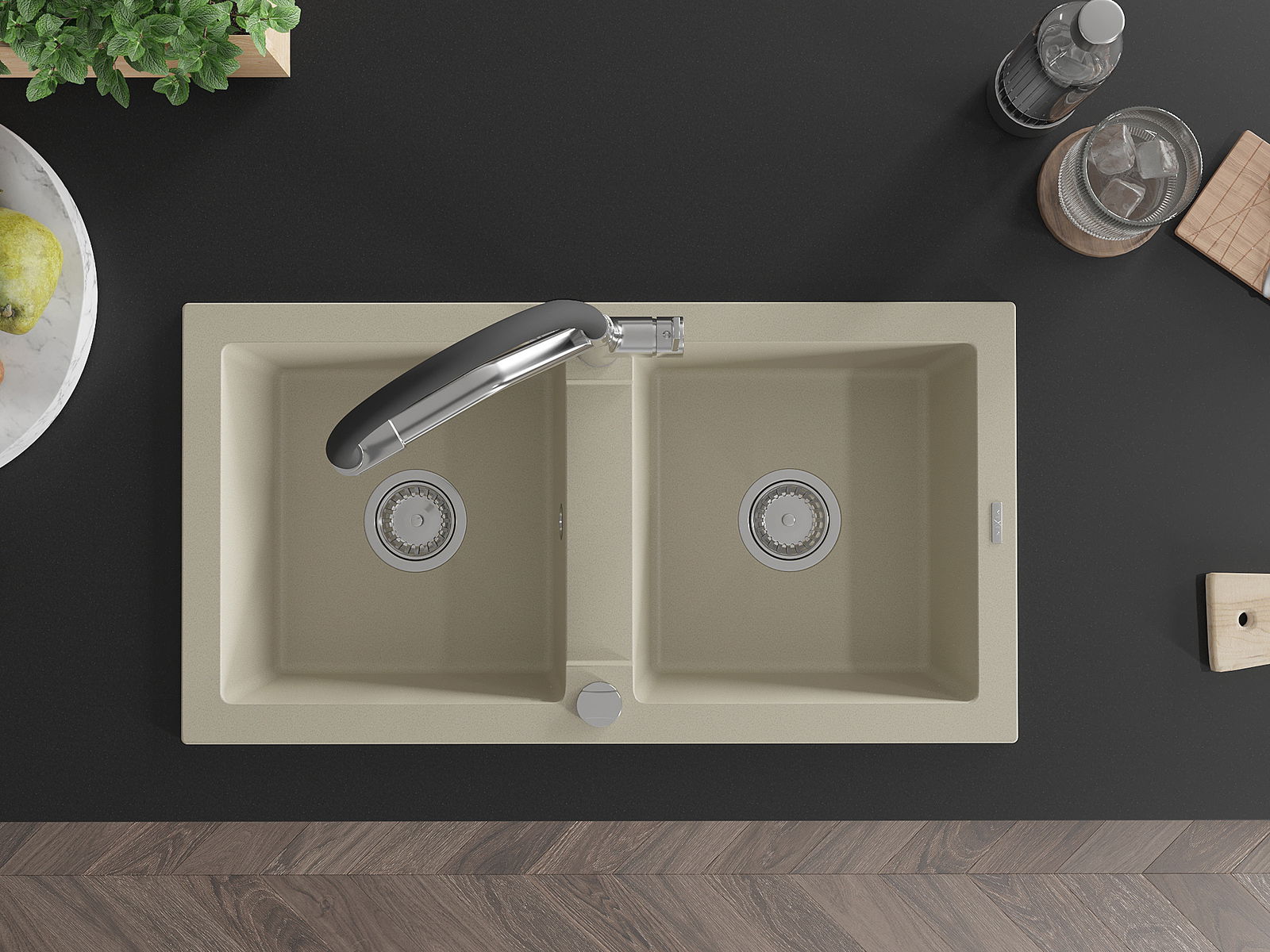 Mexen Mario divkupavieta ar divām granīta bļodām un virtuves jaucējkrānu Duo, bēša - 6504-69-671701-07