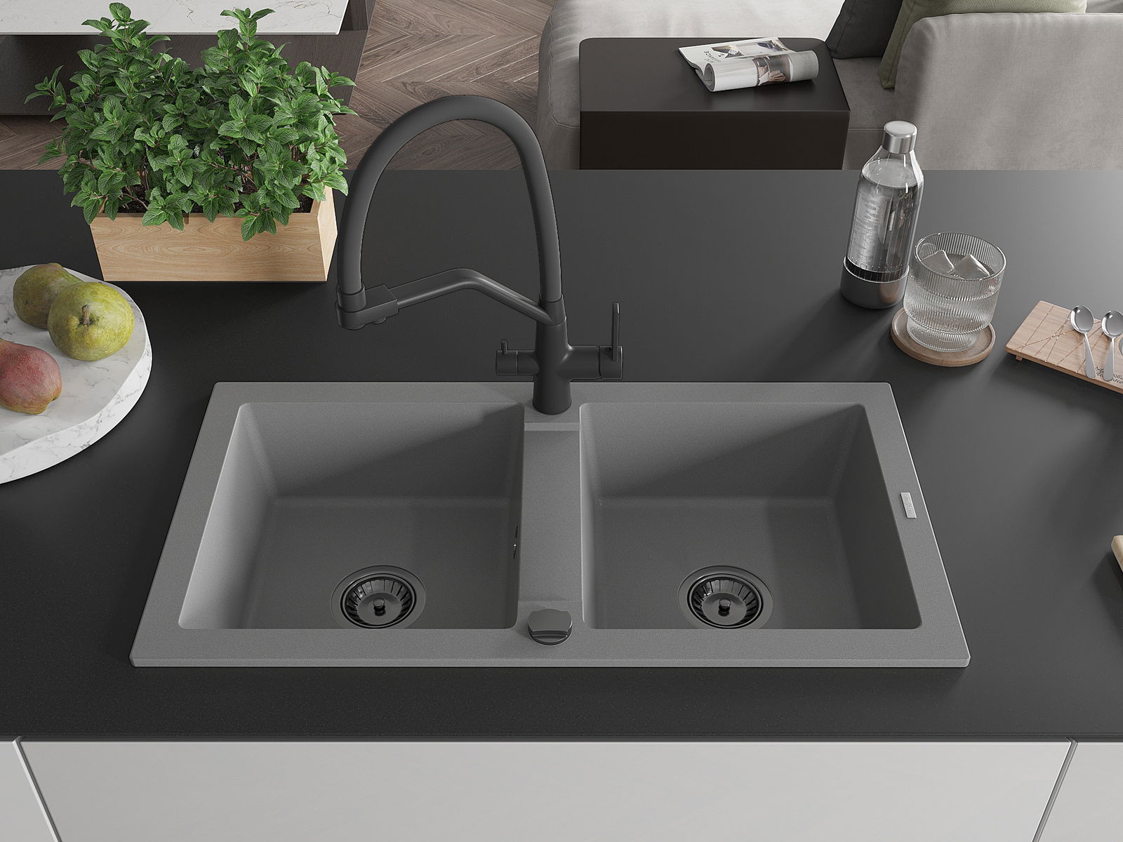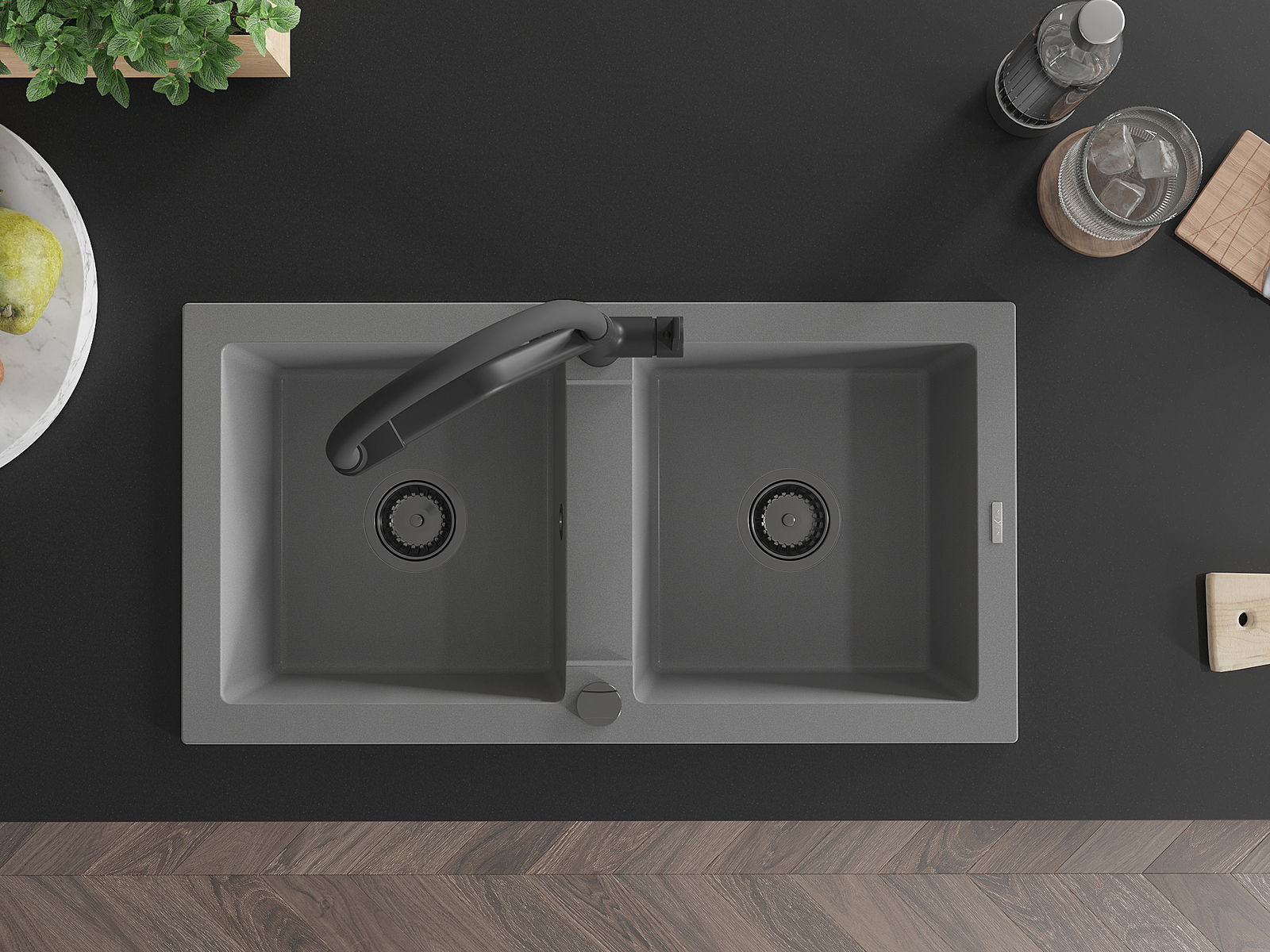 Mexen Mario granīta divkameru izlietne ar virtuves jaucējkrānu Duo, pelēka - 6504-71-671701-70-B