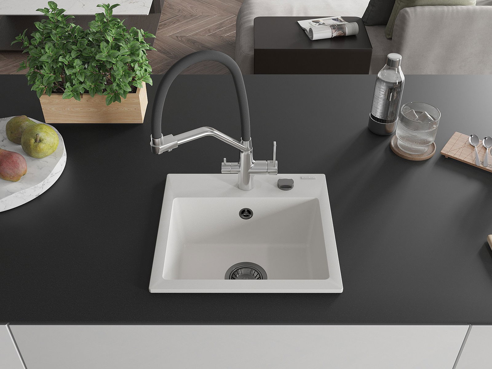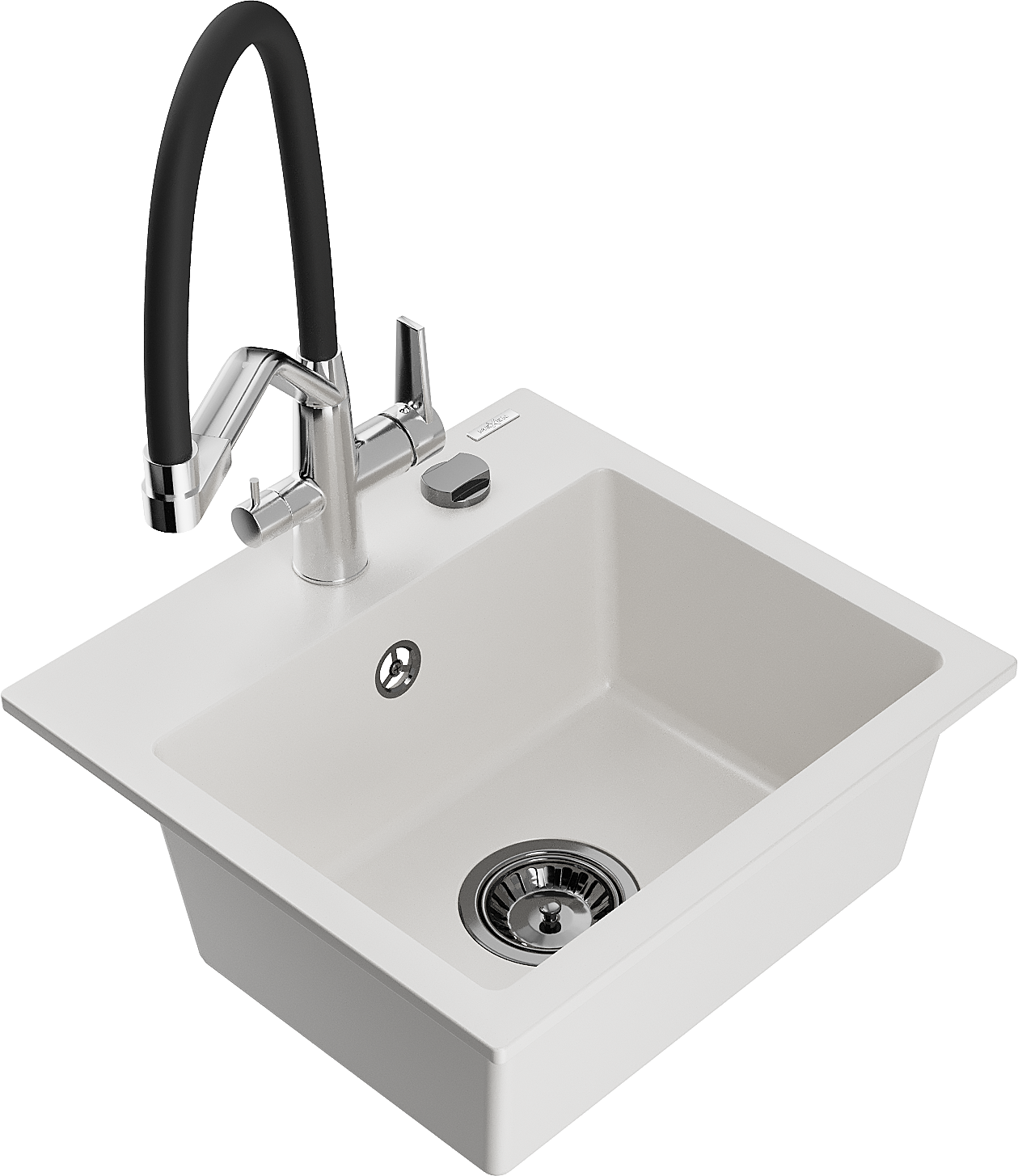 Mexen Milo granitā izlietne ar vienu nodalījumu un virtuves jaucējkrānu Duo, balta - 6505-20-671701-07-B
