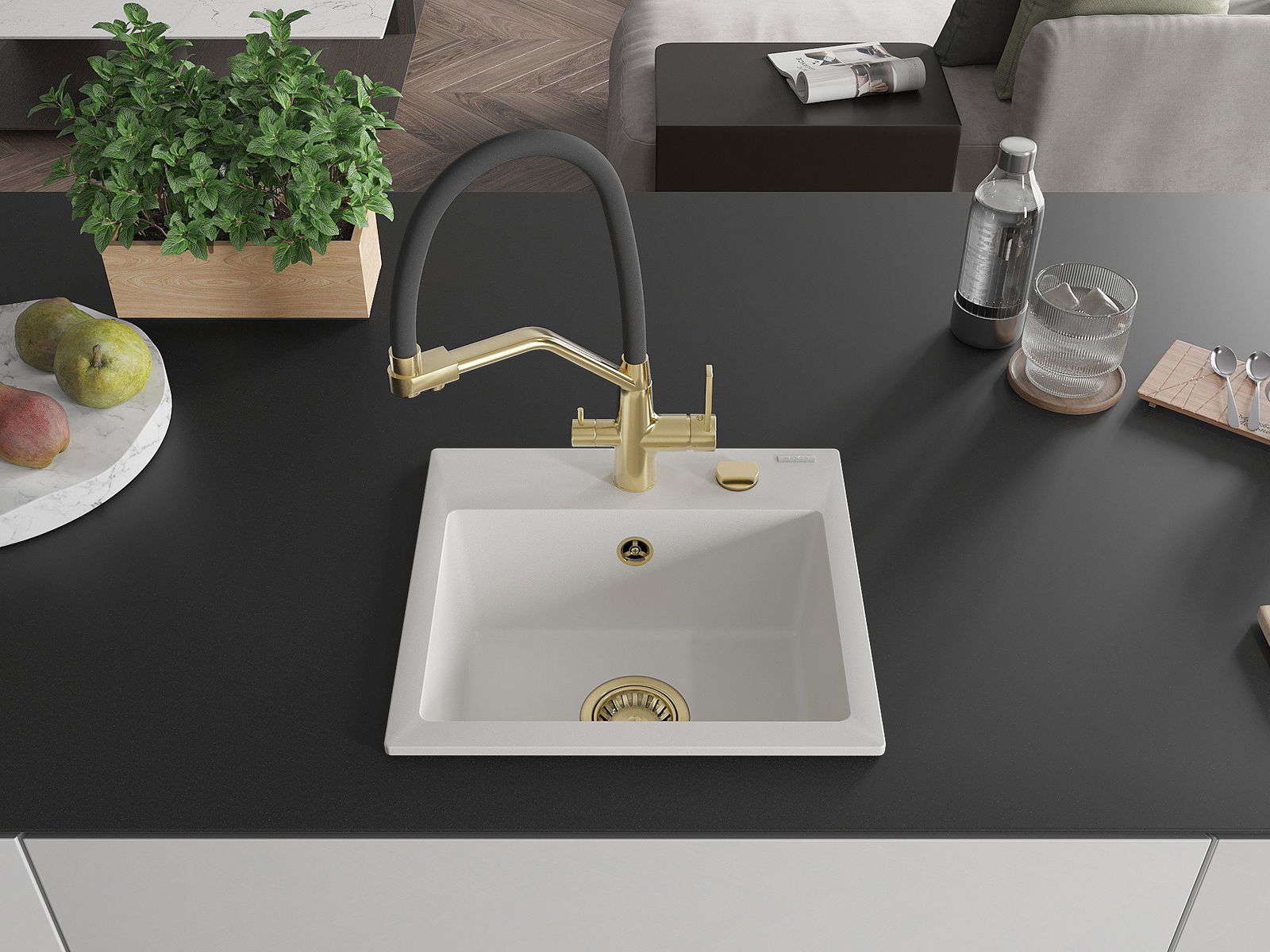 Izlietnei ir padziļināts caurums ar diametru 35 mm, kuru varat izsist patstāvīgi. To var izmantot, piemēram, šķidruma dozatora uzstādīšanai, kas novērsīs plastmasas pudeļu klātbūtni virtuvē un piešķirs tai elegantu apdari.