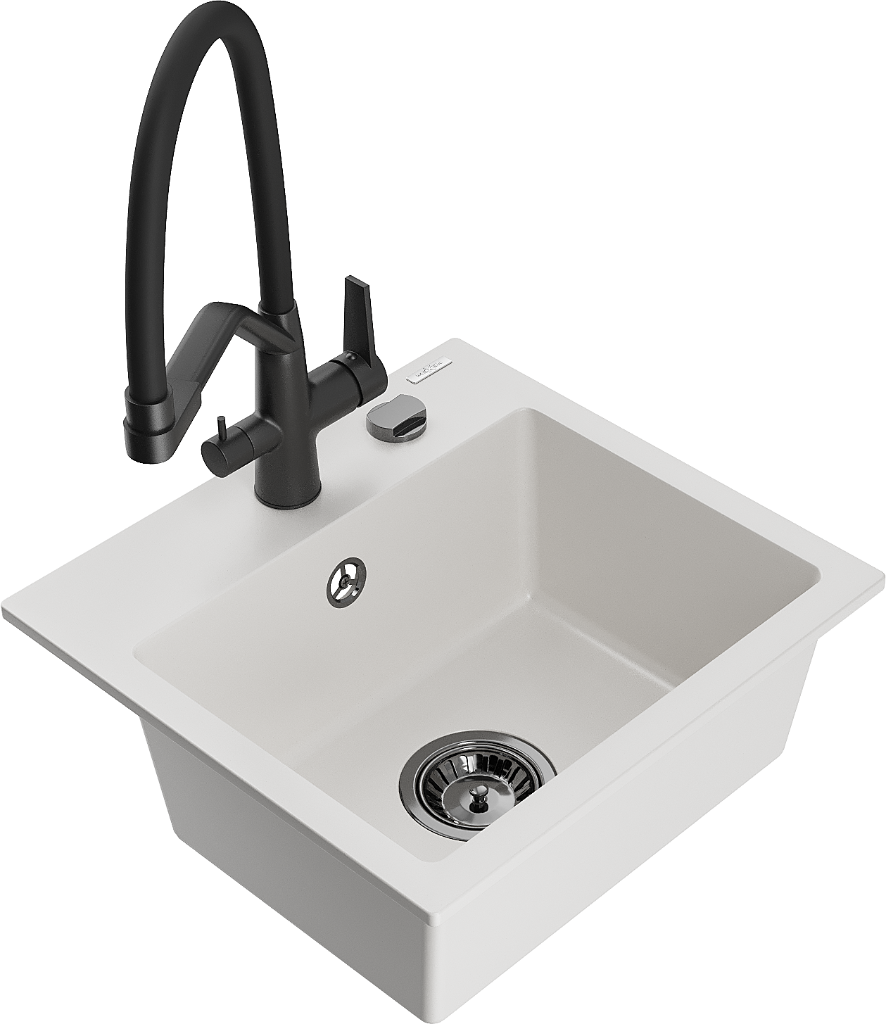 Mexen Milo granitā izlietne ar vienu nodalījumu un virtuves jaucējkrānu Duo, balta - 6505-20-671701-70-B