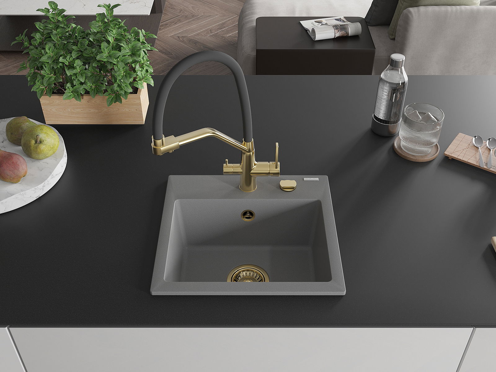 Mexen Milo vienas granīta izlietne ar virtuves jaucējkrānu Duo, pelēks - 6505-71-671701-57-G
